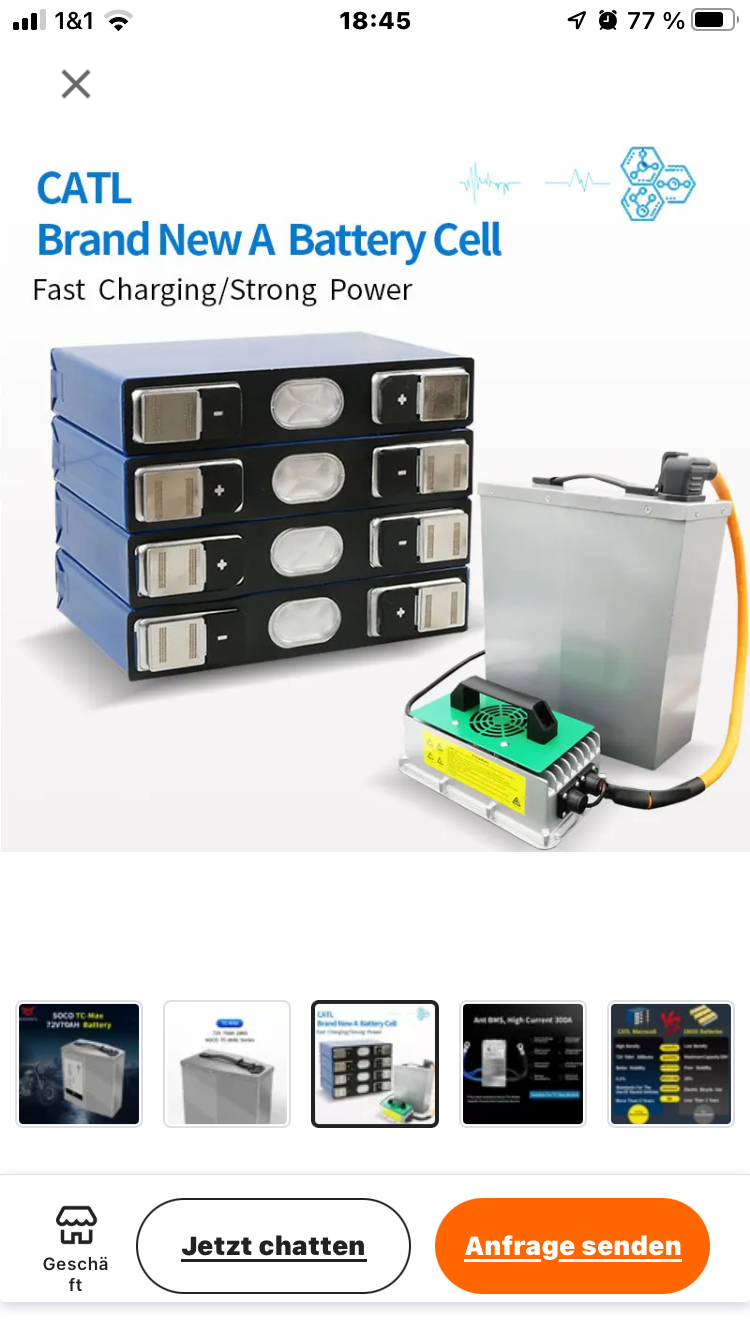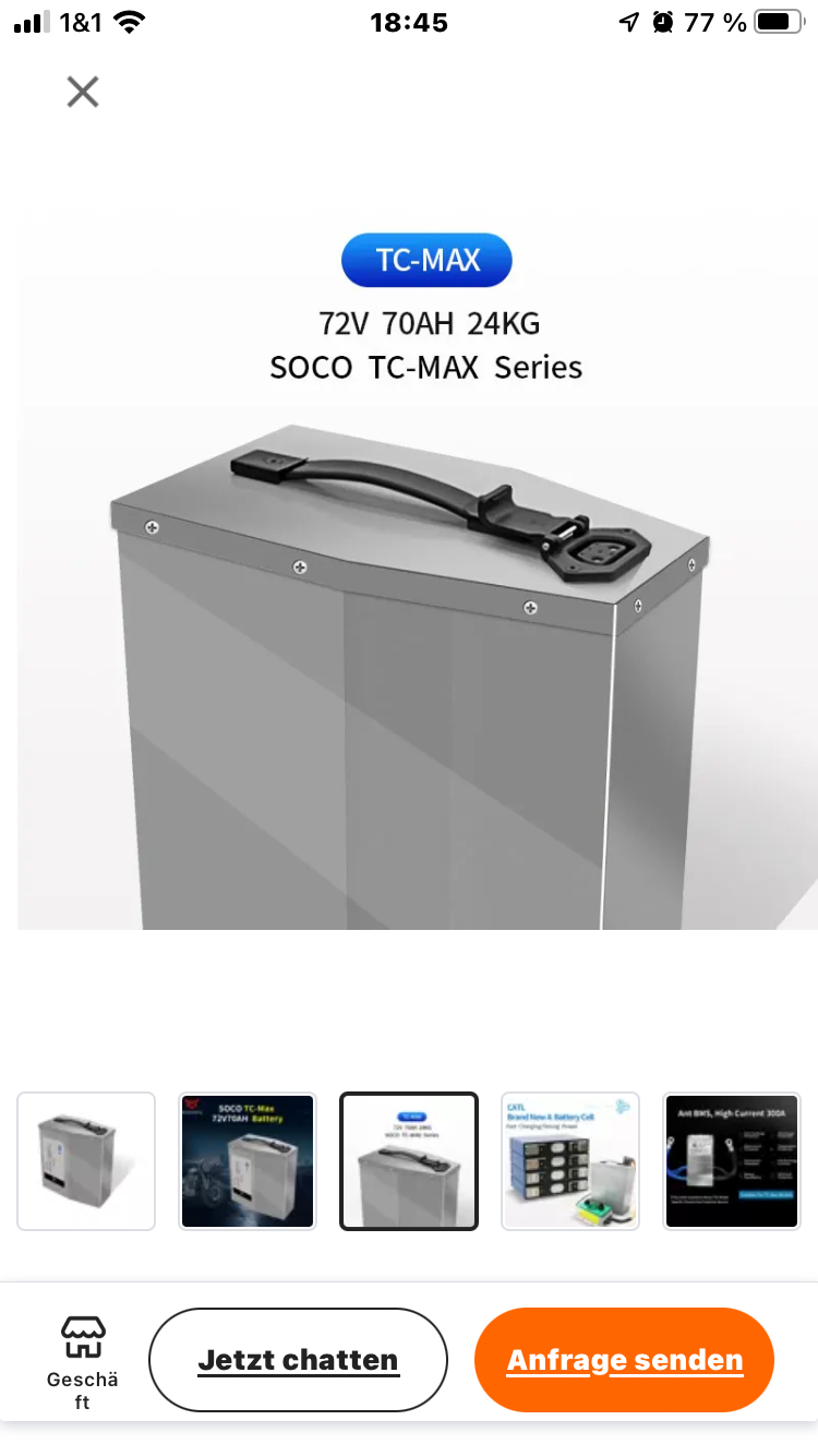 Preis 1799€ inkl.Versand usw. 72 Volt 70 Ah mit CATL Zellen, die 70 Ah kann ich nicht bestätigen, ich komme keinen Kilometer weiter als mit dem Original Akku. Die Akkukapazität wird während der Fahrt nur alle 3 bis 5 Minuten aktualisiert und fällt dann um 15 bis 20% laut Anzeige im Tacho.