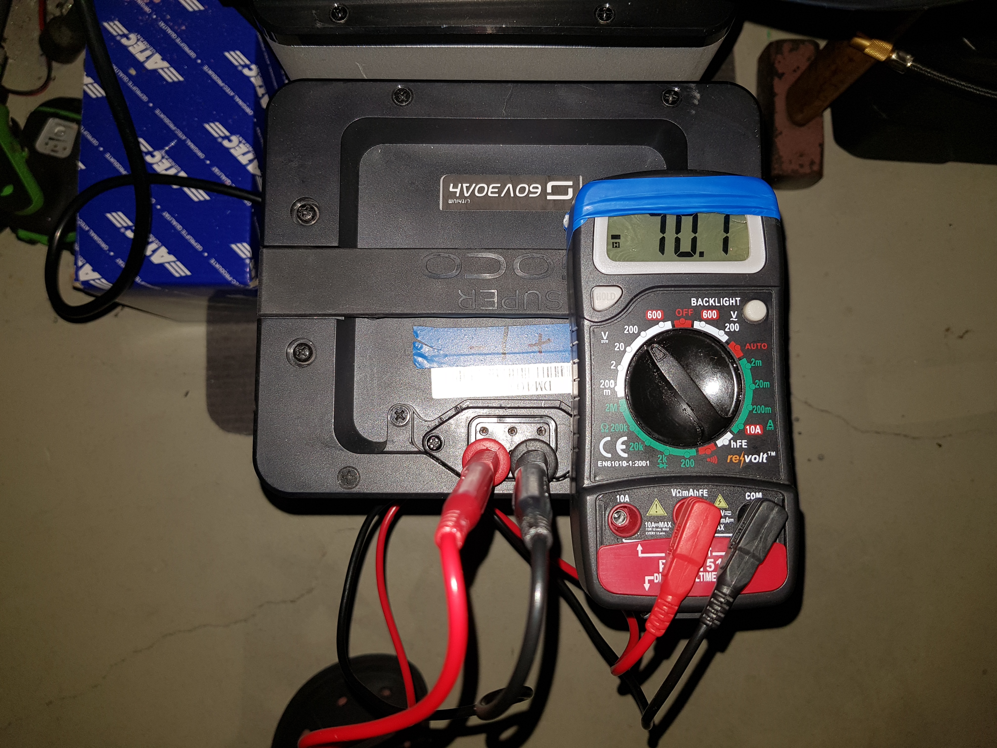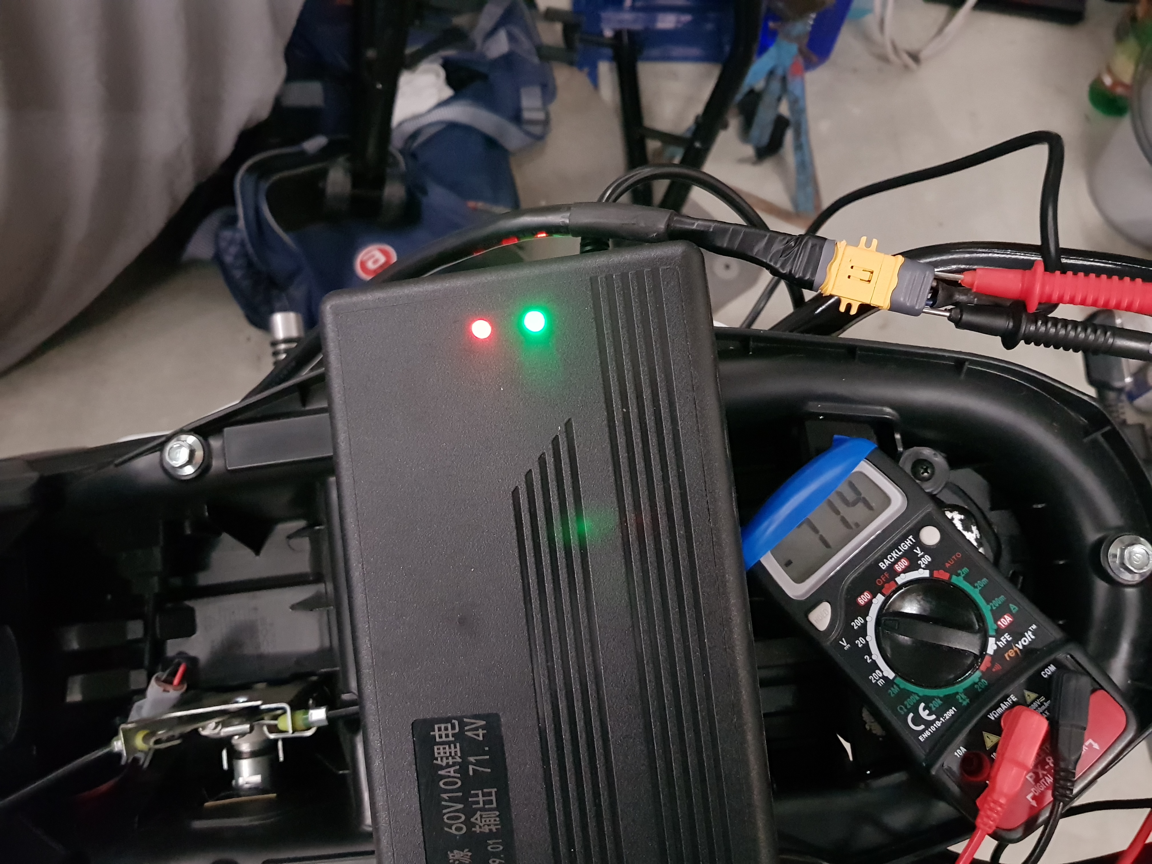 Obwohl das Ladegerät eine Leerlaufspannung von angegebenen 71,4V hat, habe ich 71,2V gemessen. Die Akkus sind bereits im "Winterschlaf", ich kann mich aber daran erinnern das direkt nach dem Laden beide Akkus eine Spannung von nur knapp 70V anlag. Somit schaltet auch dieses Ladegerät vor erreichen einer vollen Ladung ab.