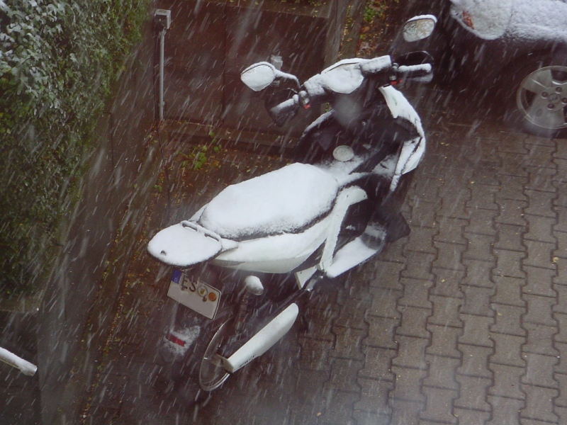 Da jetzt aber mein Batteriekasten zu ist habe ich noch keinen Bock, wieder die Haube aus der Garage zu holen. Da ist die morgendliche Schneebefreiung wesentlich schneller und weniger anstrengend als Haube weg, ausschütteln, zusammefalten, und abends wieder das Ganze retour.Im letzten Winter hat sie mir aber die Batteriewärme einiges besser erhalten über Nacht als mit dem "nackten" Roller, vielleicht tut jetzt der Batteriekastendeckel diesen zusätzlichen Isolierdienst. Auf jeden Fall wird es eine mords-Heizrunde in der Nacht von Sonntag auf Montag geben müssen, weil übers Wochenende trotzdem die Batteie ziemlich gut auskühlt. Zur Zeit ist sie gerade noch 3° wärmer als die Umgebung, die um 2,1°C dümpelt.