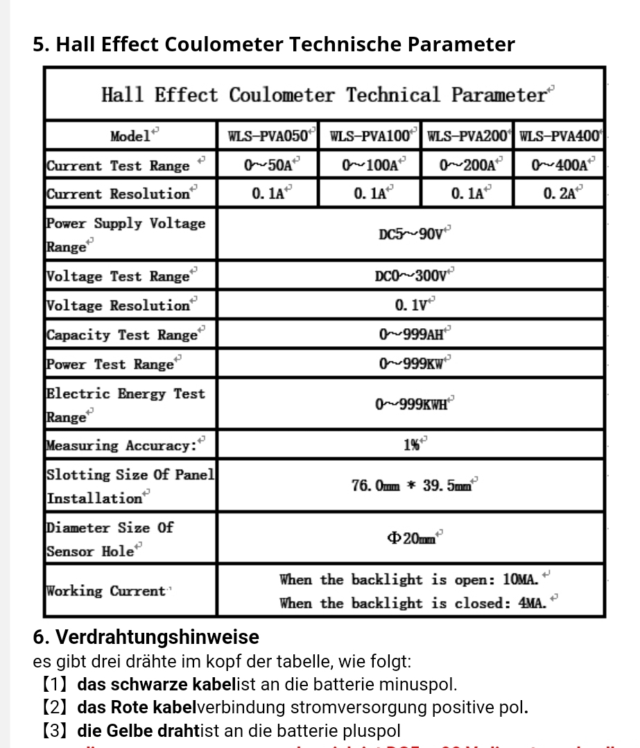 Der andere Knopf kurz halten stellt die Strommessung auf Null. Der Wert wandert um bis zu 0,3 A weg über Stunden scheint mir. Manchmal zeigt er auch minus an, er kann wahrscheinlich die Richtung anzeigen. Es ist auch ein Pfeil auf dem Abnehmer.