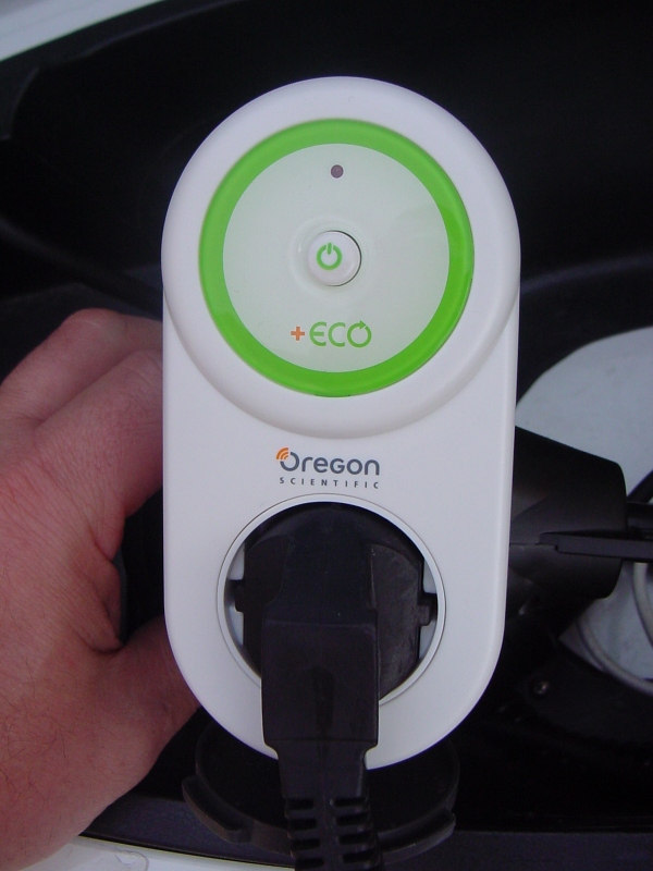 Es ist eine Combo aus einer sehr schlicht aussehenden Zwischensteckdose (die es aber in sich hat) und einem Display mit Knöpfen und Sender-/Empfänger im 2,4GHz Frequenzband (wie z.B. Garagentor-Fernsteuerungen). Das Ding schimpft sich "Oregon Scientific ESM600 Wireless Appliance Manager", was die Anwendung schon ganz gut umschreibt.