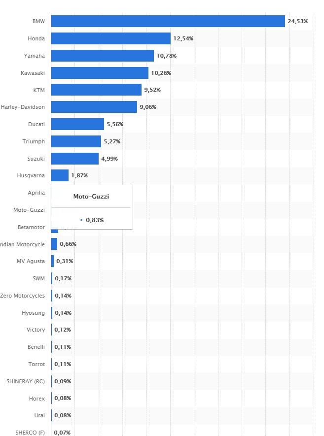 Auf Grund von Off-Topic-Posts sehe ich ein Interesse der hiesigen User an statistischen Auswertungen, welchen Anteil Elektromotorräder an der Gesamtzahl der Motorräder haben. Die Antwort ist einen verschwindenden Anteil.