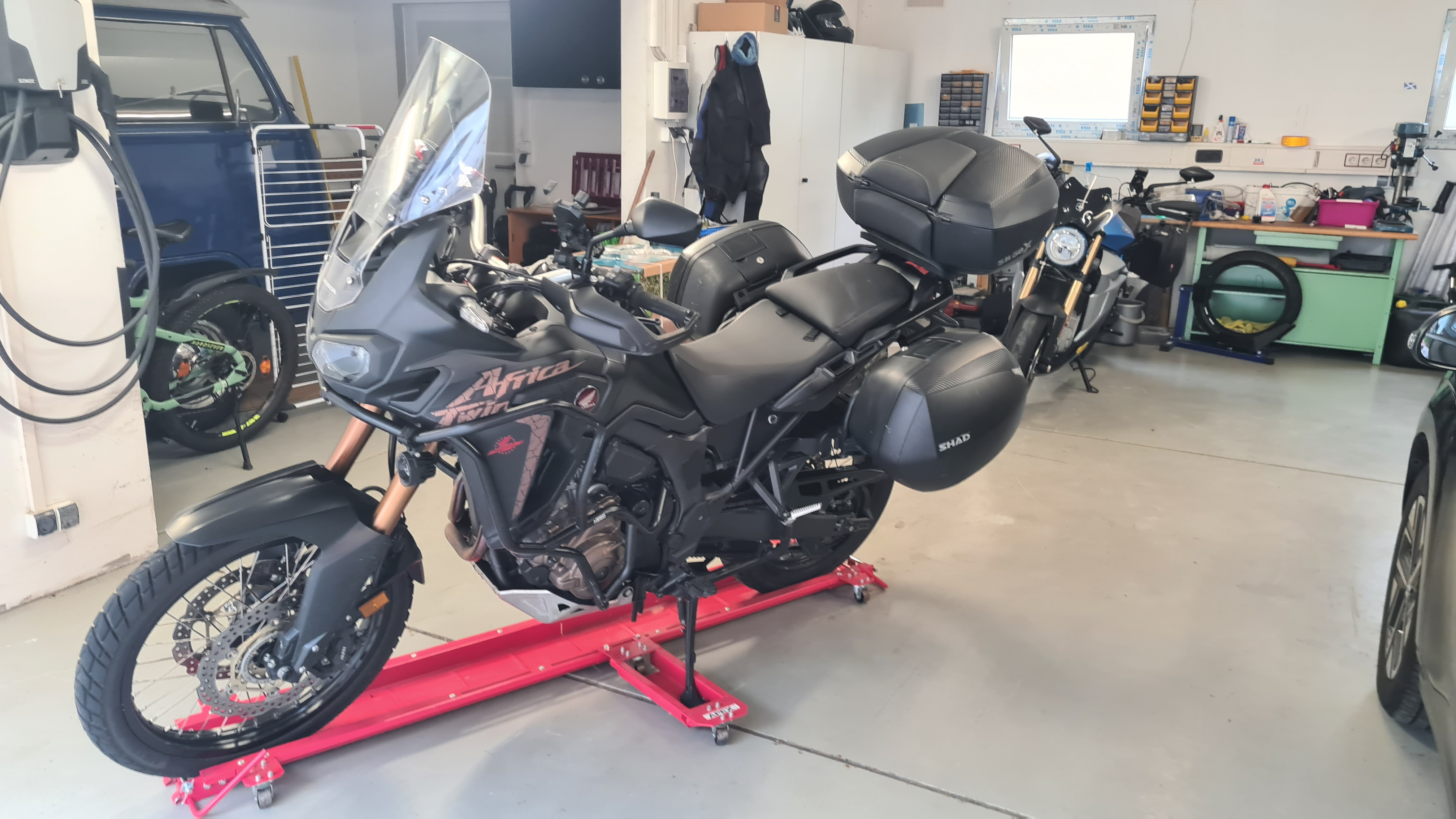 Kollege hat seine CBR1000RR immer mit einem selbst konstruierten "Rollbrett" quer in der Garage geparkt. Da stand das Mopped auch Kerzengerade drauf.