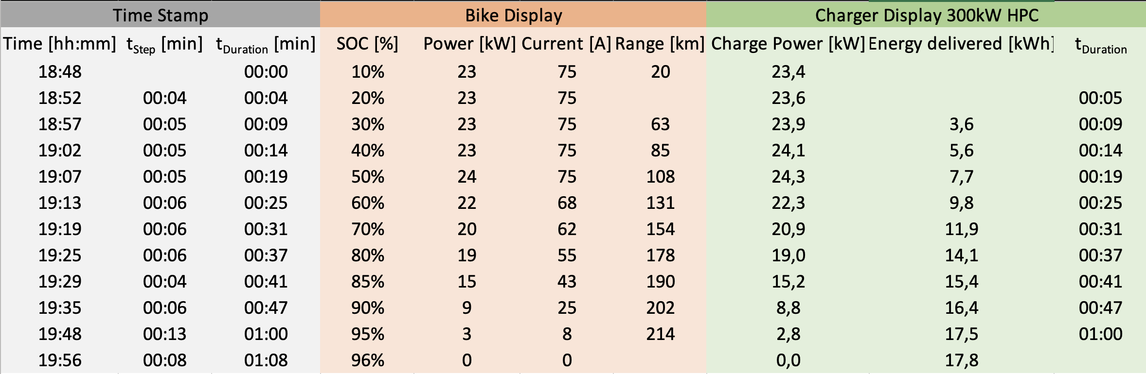 Besonders jetzt von der ExPee habe ich die Anzeigen der Ladeleistung sowohl vom Bike, als auch vom Lader notiert (letzteres ist im Graph verarbeitet)