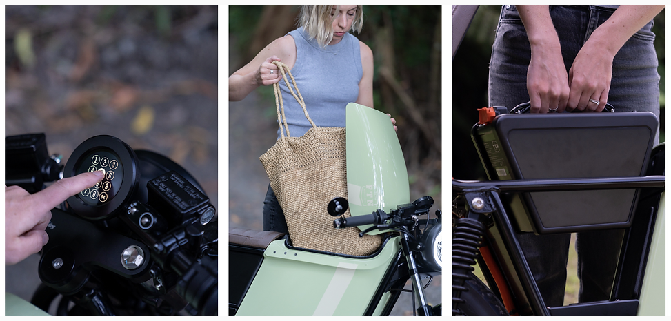 Aber genau da muss es hingehen um die Hausrunde und den Weg zur Arbeit zu dekarbonisieren. Schicke stylische Cafe-Racer-Bikes, die gerne gefahren werden (so wie ich meine SuperSOCO TC). Besonders mit diesem nützlichen Tank, der von oben bis unten zum Rahmenende leer ist und als Stauraum verwendet werden kann. Unter dem Sitz ist die trapezförmige 2,9kWh-Batterie, die (nach aufklappen vom Sitz) entnehmbar und im Warmen drinnen aufladbar ist. Das runde Display ist ein Touchscreen. Das Bike kann daher zusätzlich zum RFID-Chip, den man seitlich an das Logo im Tank halten muss, auch per PIN entsperrt werden.