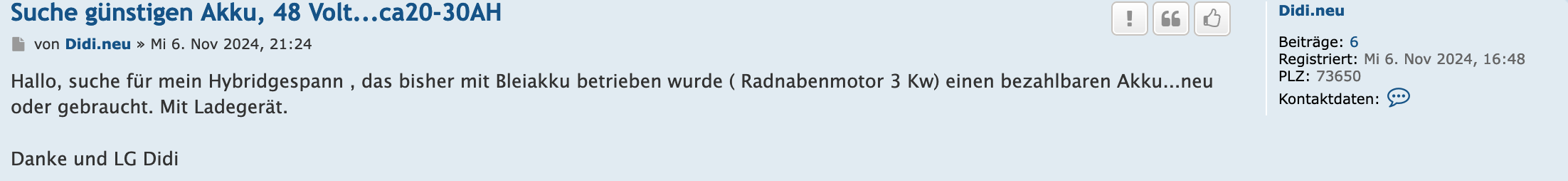 Die 20 kg Mehrgewicht gerade an dieser Stelle sehe ich gar nicht mal als Nachteil an.error hat geschrieben: ↑Mi 6. Nov 2024, 22:11Dem stehen dann geschätzte 20 kg Mehrgewicht plus erhöhter Widerstand des Motors bei erschöpftem Akku gegenüber. Der Motor braucht in diesem Fall einen Freilauf, oder man muss sich darüber Gedanken machen, wie man die entstehenden Induktionsspannungen des mitdrehenden Motors im Zaum hält.