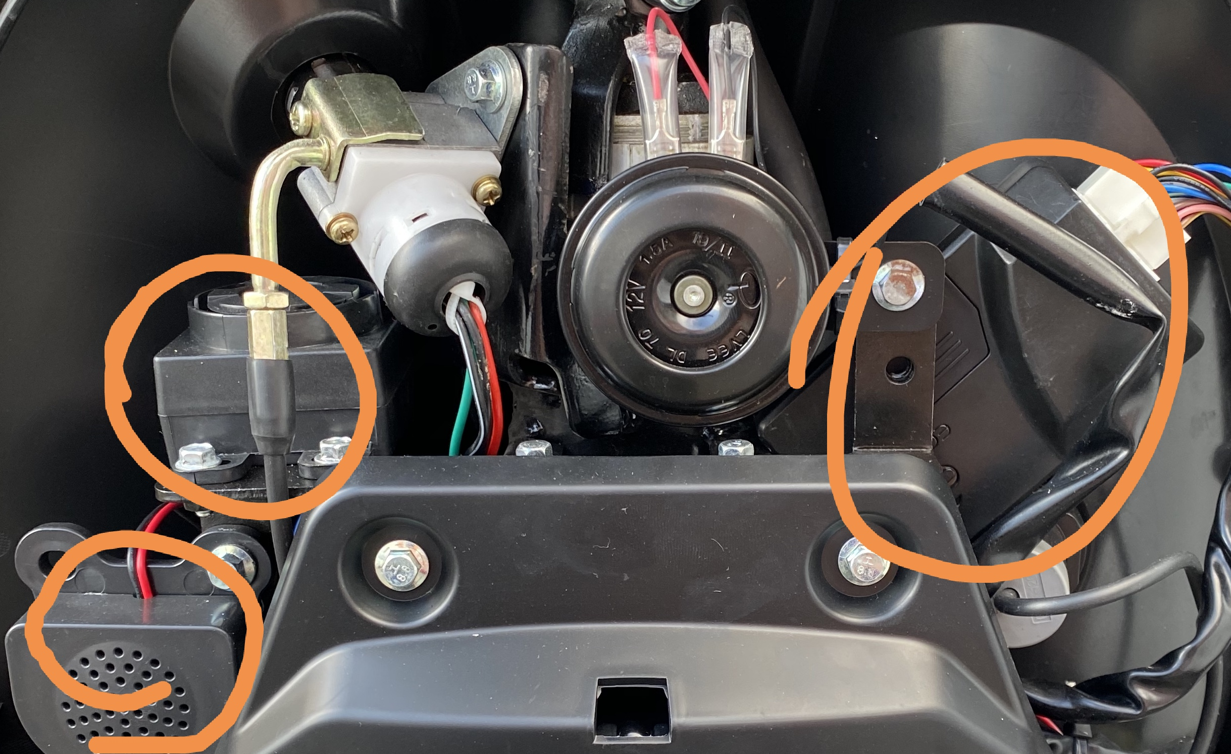 Die markierten Teile fehlen bei mir... Was ist davon was? Bzw was davon könnte Einfluss auf die Blinker haben? Wie gesagt, ansonsten funktioniert der Roller 1a.