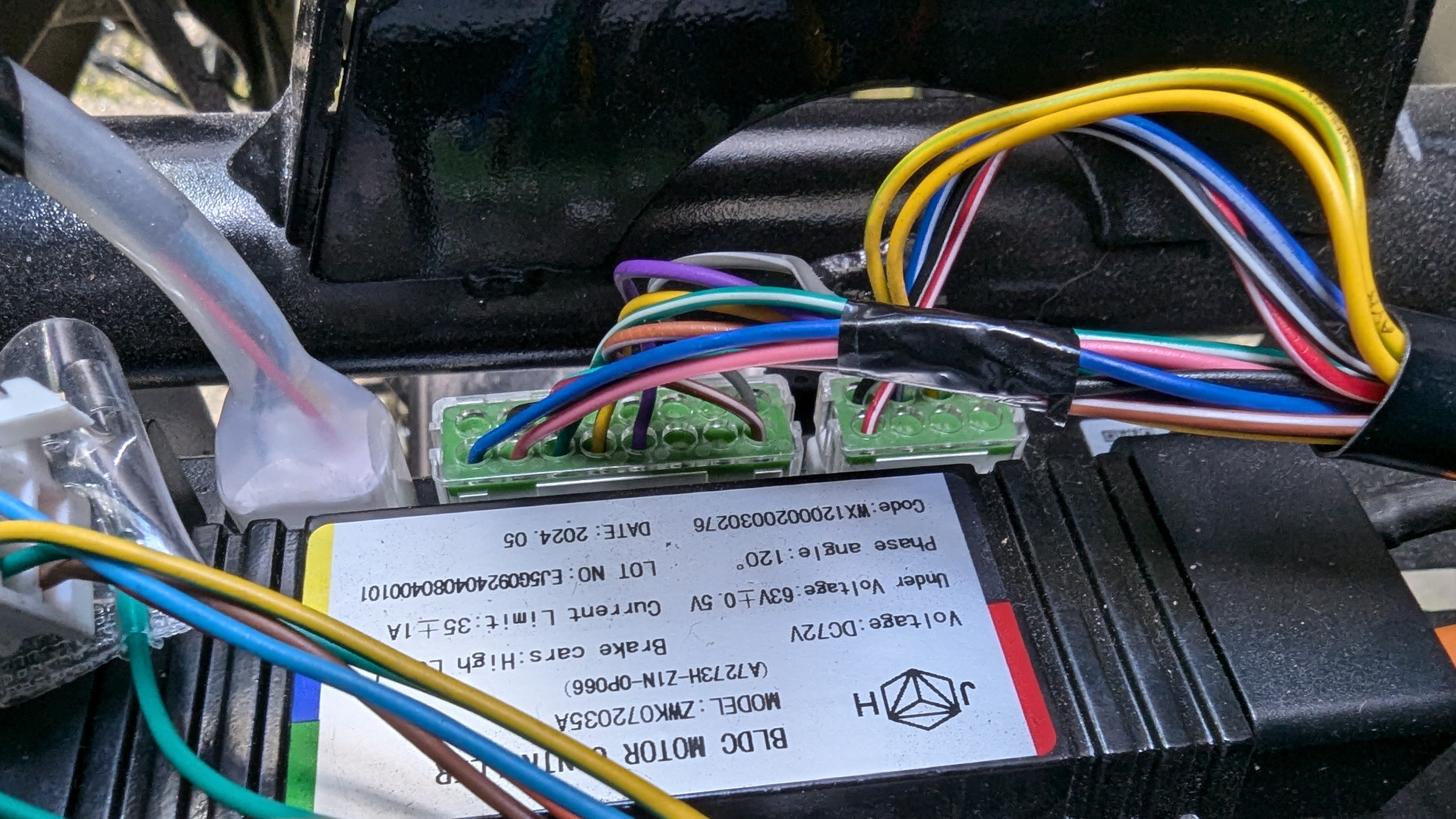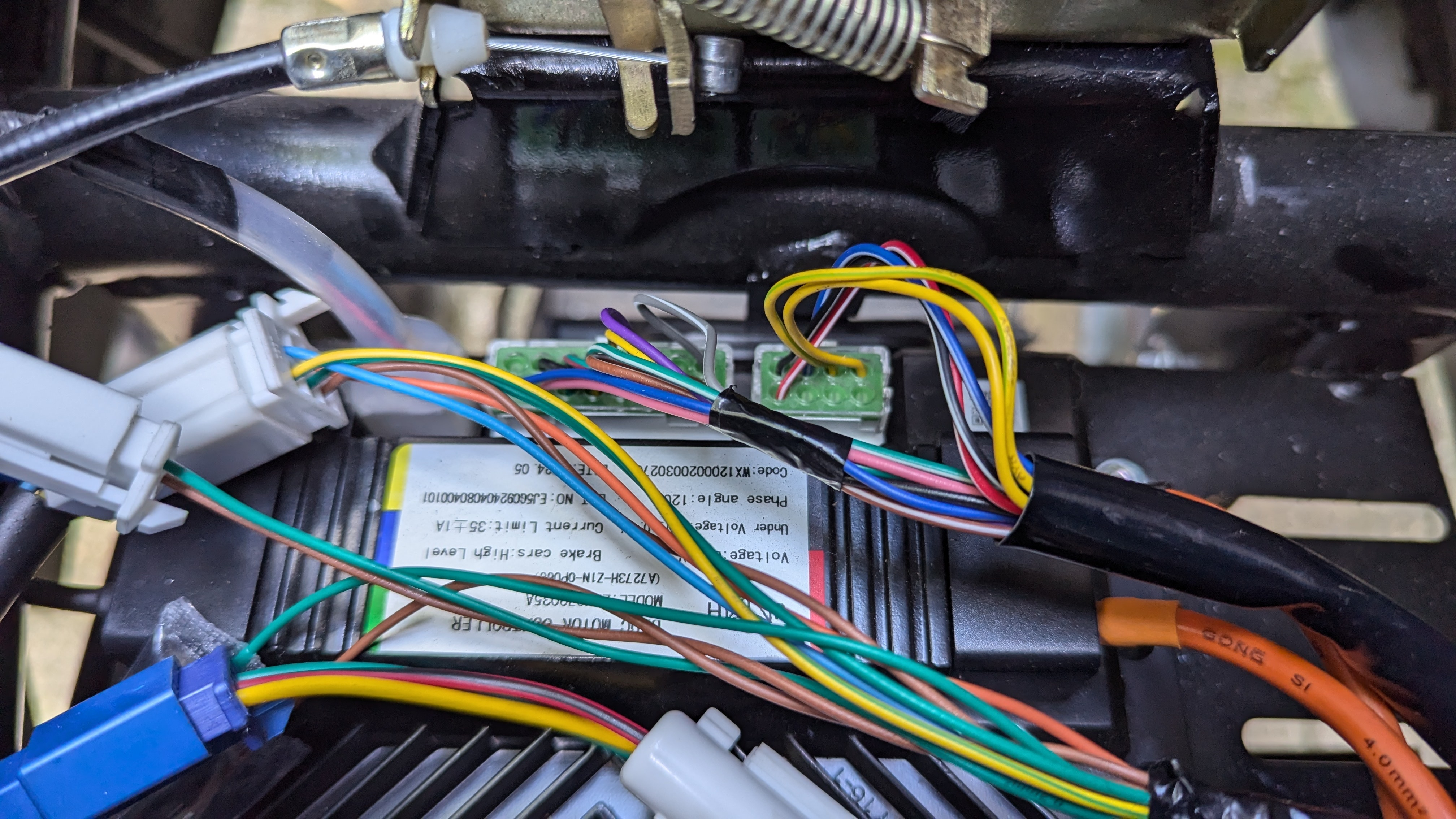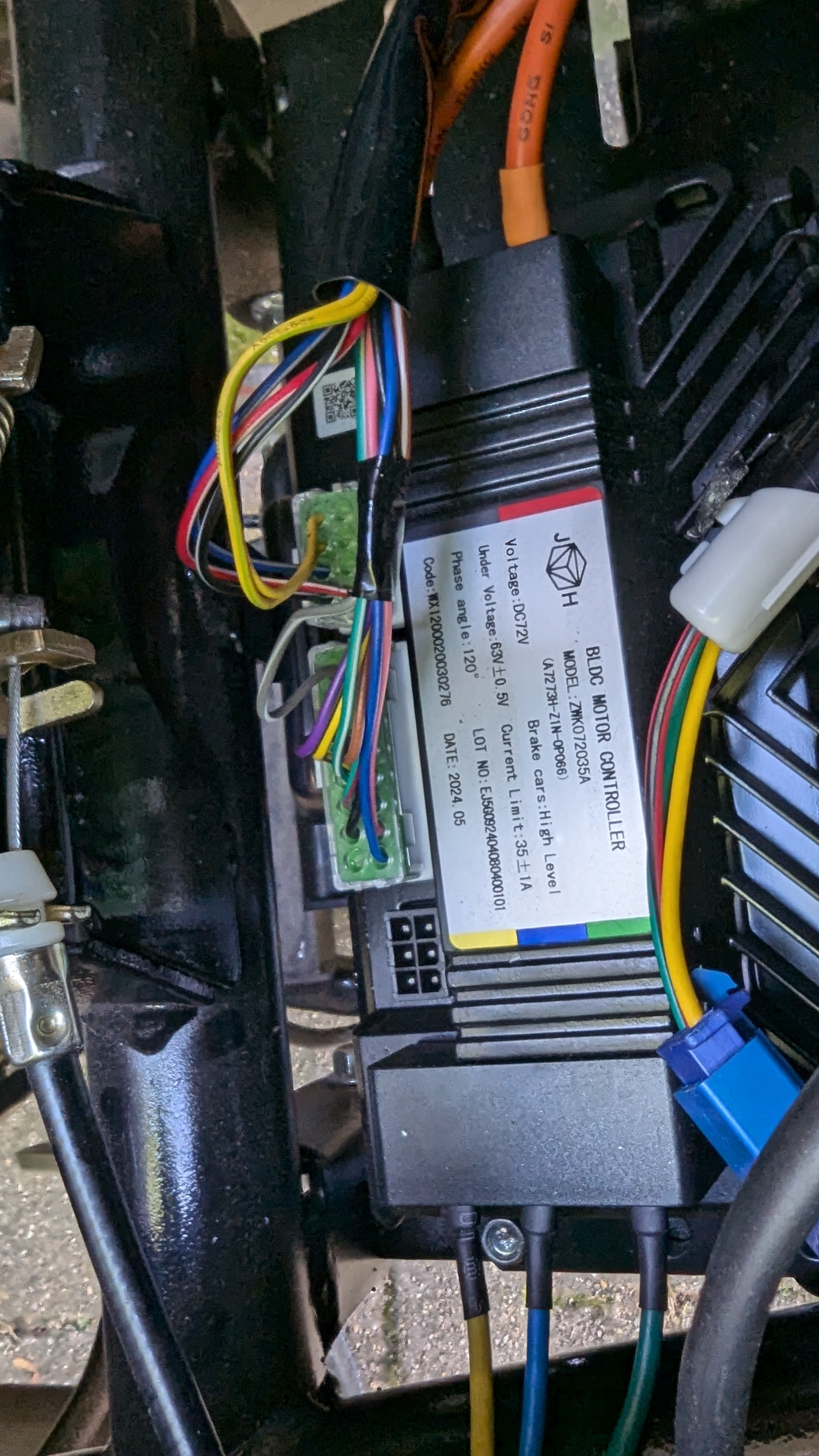Leider sind die Anschlüsse nicht eindeutig erkennbar, abgesehen vom Hall-Sensor-Stecker. Dieser scheint jedoch zum Lingbo LBMC72252 V5 (48V-72V, 100A, Peak 300A, 4kW Sinuswellen-BLDC-ECU) für Elektro-Roller oder Mopeds zu passen. Es schein so ob die Verbindungen gelötet ist.