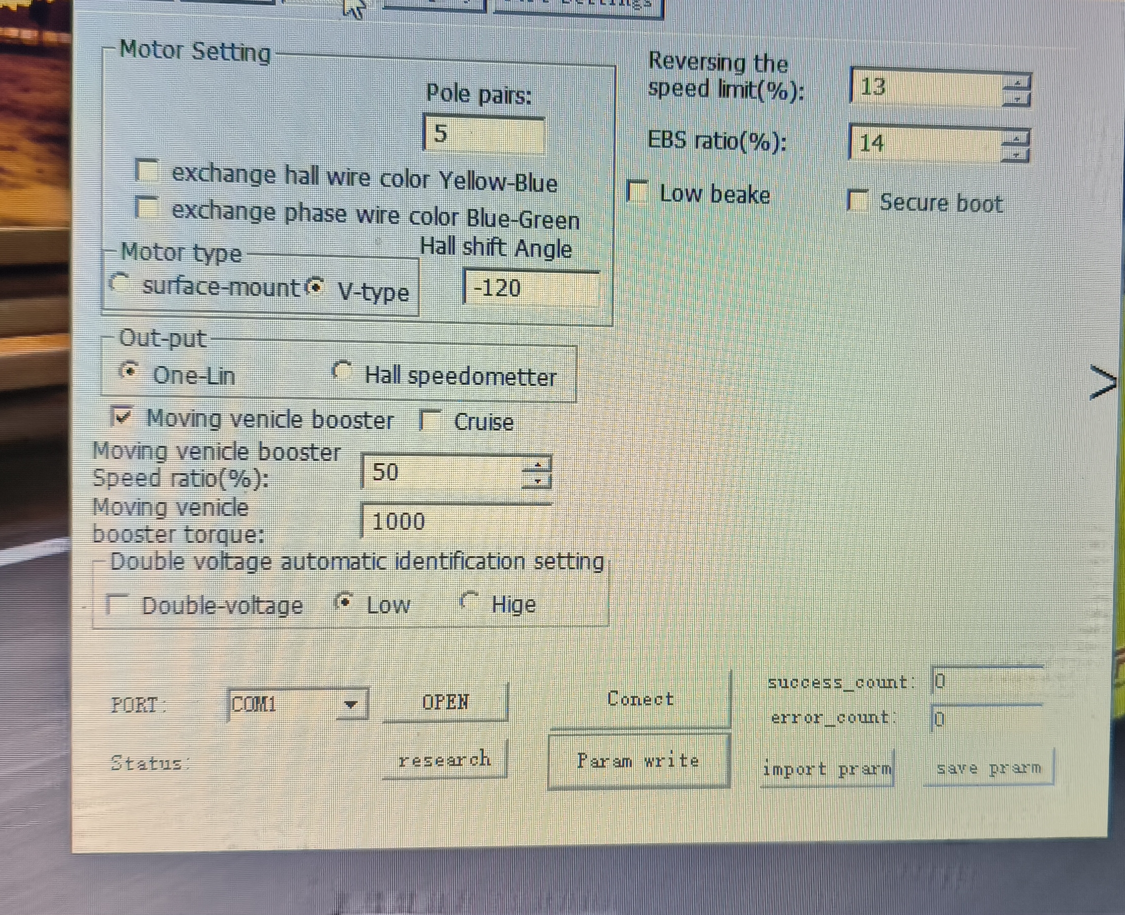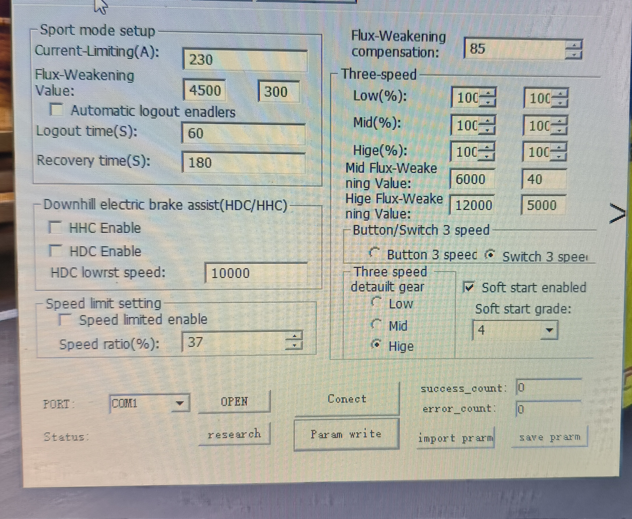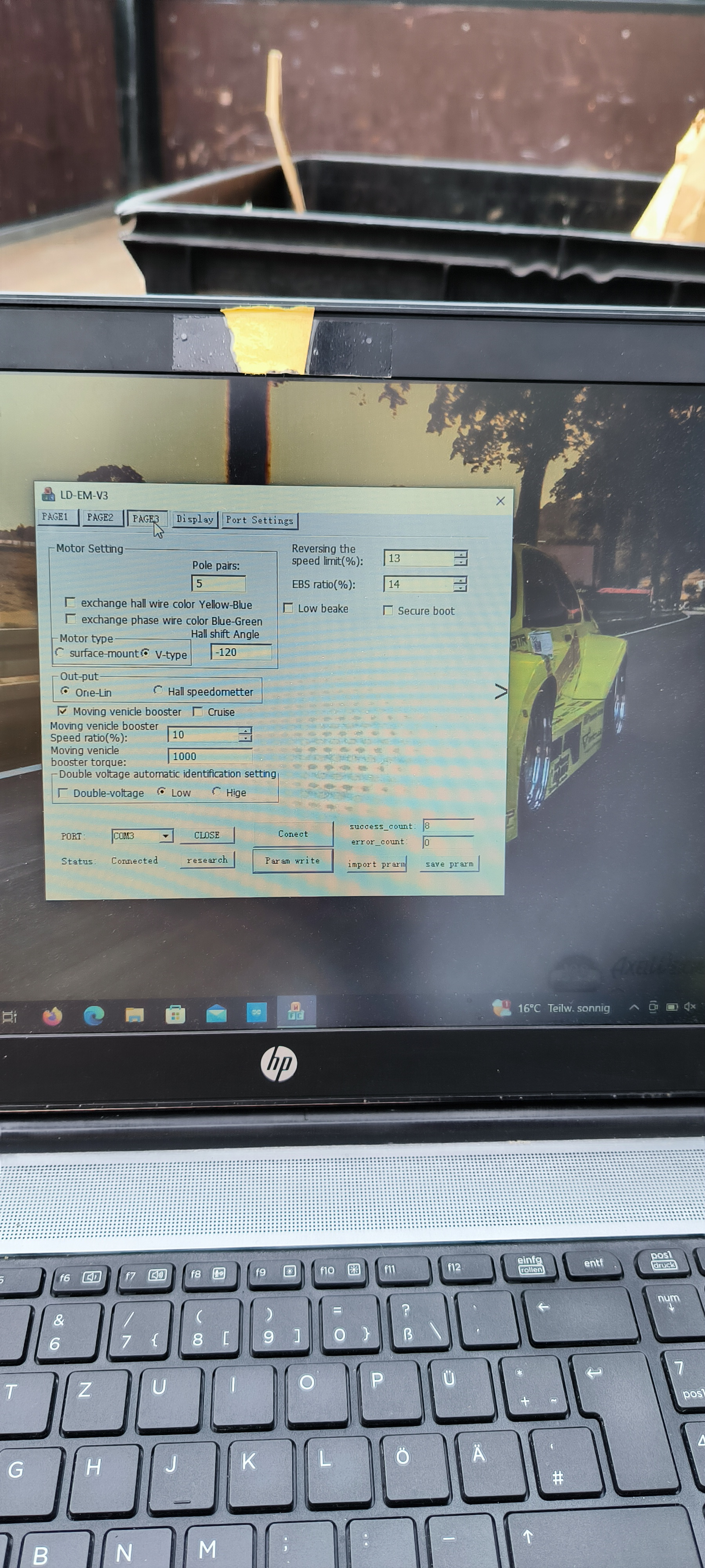 Versuch auch einmal die zu programmieren, ohne dass an den throttle-Leitungen etwas angeschlossen ist. Dann geht der Controller natürlich auch auf hall fault, weil ja kein Signal kommt, aber evtl. klappt dann das Abspeichern der Werte. Der hall fault geht m. E. immer an, wenn die throttle-Signalspannung beim Einschalten unter 0.4 Volt liegt (Erkennung -> kein Gasgriff dran) oder im Betrieb über 5.2 Volt erreicht. Werte oberhalb lassen sich auch nicht programmieren (vielleich verschluckt er sich auch daran). Ich kann bei mir (72 Volt am Controller) die untere Fehlerschwelle auf 0.3 Volt setzen und die obere auf 4.95 Volt (kann sein, dass auch mal zwei Stellen hinter dem Punkt notwendig sind, damit er das schluckt).