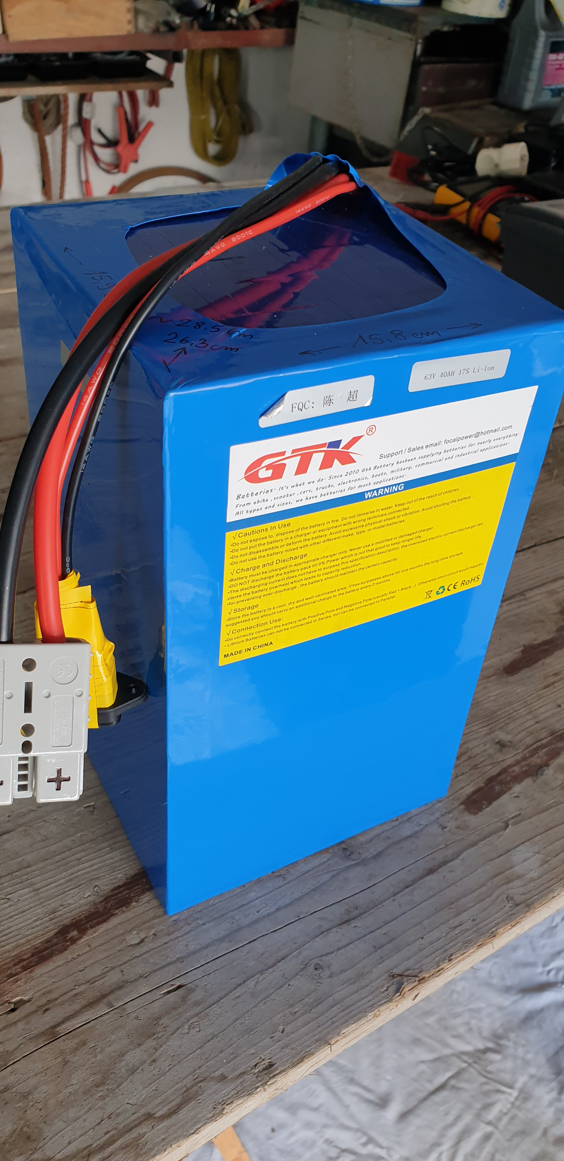 für 438,29€ incl. ALLEN Steuern und Gebühren. 17S 62,9V 40Ah. Er wiegt 10,9 Kg. Die Maße sind LXBXH 159 X 158 X 285 mm. Wollte ursprünglich einen LIFEPO4 Akku haben - jedoch hat es mit den Maßen nicht gepasst. Die Maßen scheinen bei Ali - GTK Akkus wohl nicht immer zu stimmen. Bei mir hat´s dann doch gepasst. Um noch mehr mögliche Ladezyklen zu bekommen - den Akku Verschleiß zu mindern, lade ich den Akku nur jedes ~ 30igste mal ganz voll - ansonsten nur zu ca. 90% voll mittels Ladespannungs Absenkung.