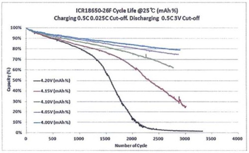 wieviel er driftet. Ich habe bei meinen 2. Roller einen 32AH Akku 17S mit einem zusätzlichen Akku Pack (Selbstbau, 14 Zellen 18650 Parallel) in Reihe geschaltet und lade alles in Reihe mit einem in der Spannung etwas hoch gekurbelten Original Ladegerät auf 73,2 Volt. Der Zusatz Akkupack hat ja kein BMS, verträgt sich aber sehr gut mit den anderen Zellen in Puncto Spannungs Balance. Auch hier lade ich ca. jedes 30.-igste mal alles separat um die 4,2 Volt genau zu erreichen ... Ich denke dass eine Ladung bis z.B. 4,1 Volt je Zelle (statt 4,2 Volt) bezüglich der maximal erreichbaren Zyklen schon was bringt - siehe Diagramm ...