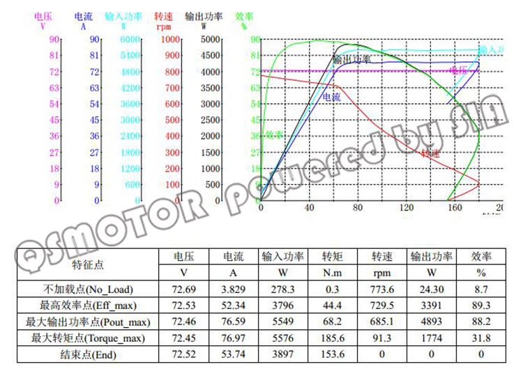 Scheinbar ist die Drehmoment/ Drehzahlkennlinie bei 48V bzw. 72V im unteren Bereich unterschiedlich. Generell erreicht ein BLDC Motor seine höchste Leistung bei 2/3 Höchstdrehzahl und das höchste Drehmoment kurz über Schrittgeschwindigkeit.