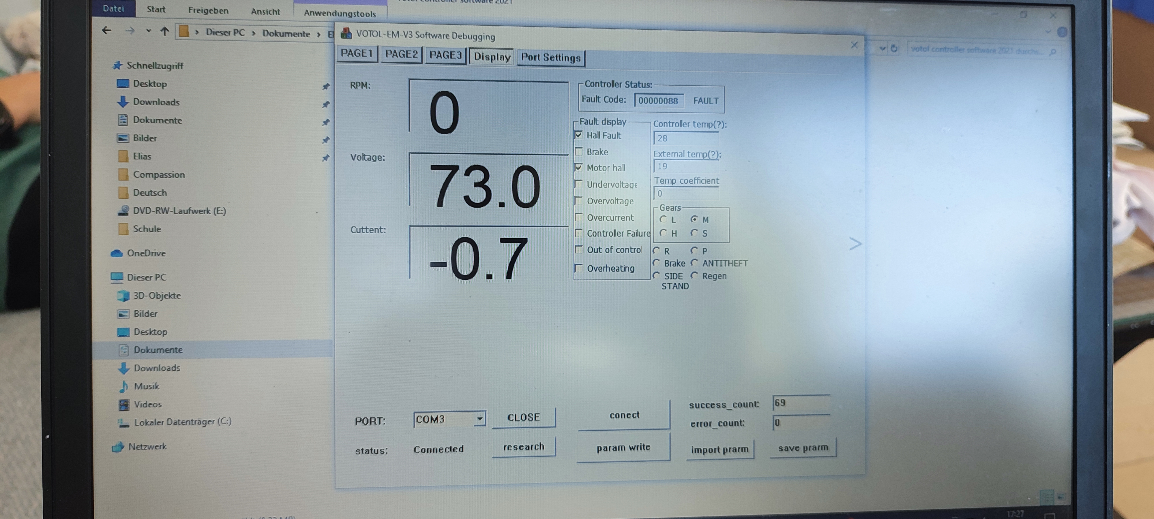 Beim nächten Neustart übernimmt er aber nur dann die Parameter, wenn er beim Hochlaufen keinen Datenkonflikt hatte. Ist also eine Änderung nicht übernommen worden (und man ist sicher, dass man es richtig abgespeichert hatte, mit success) ist die Übernahme des neuen Datensatz in das "Gehin" des Votol gescheitert, weil der VOTOL sich daran "verschluckt" hat - warum auch immer. Verändert man dann einzelne Daten klappt es irgendwann. Dann natürlich sofort den Datensatz auf PC anspeichern, z. B. als hier_hat_es_geklappt.ini statt config.ini. Von dort aus kann man sich immer näher an die Datenkonfiguration heranarbeiten bei der der VOTOL plötzlich aussteigt. Keine Ahnung, warum das Problem im konkreten Fall auftritt, aber Neuprogrammierung mit abweichenden Daten hat mir immer geholfen und inzwischen läuft mein EM150s.