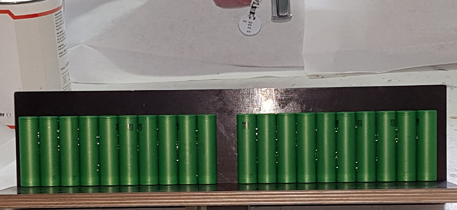 Aus zwei Streifen einer Siebdruckplatte wurde eine kliene Lehre gebaut und die Akkus darin mit Epoxydharz in 10er Reihen verklebt.