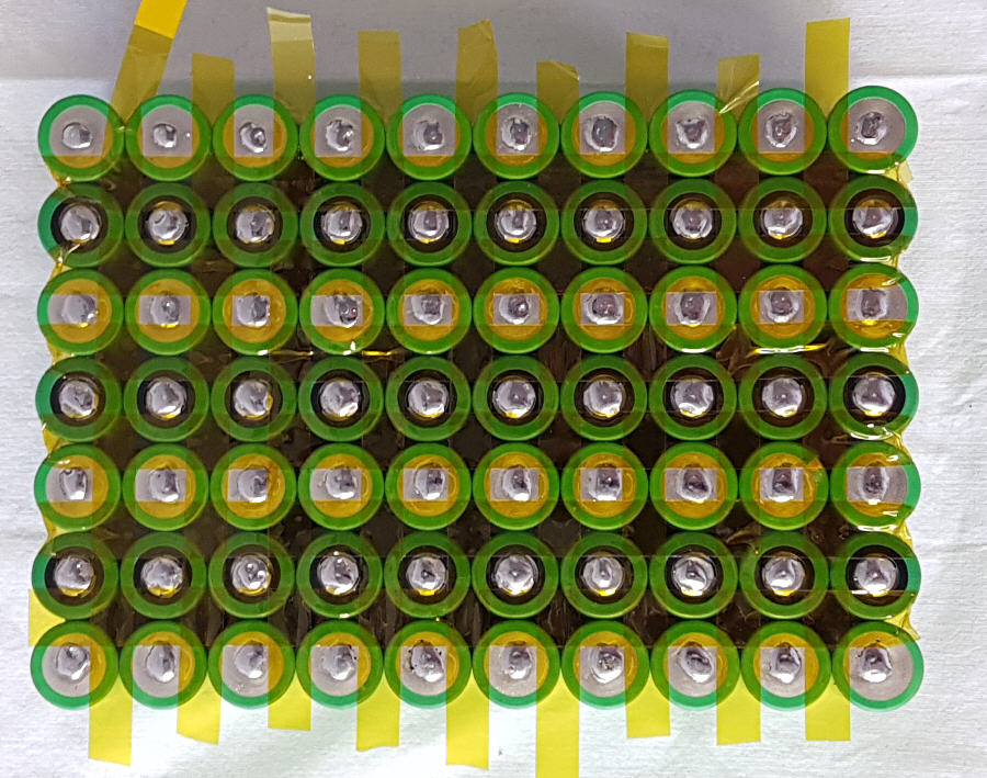 In dieser Anordnung wurden die 10er Blocks wieder verklebt, was einen stabilen Verband ergab.Für die elektrische Verbindung war zunächst Punktschweißen und Nickelbänder geplant. Die praktischen Versuche mit einem bestellten Punktschweißgerät waren aber ernüchternd.
