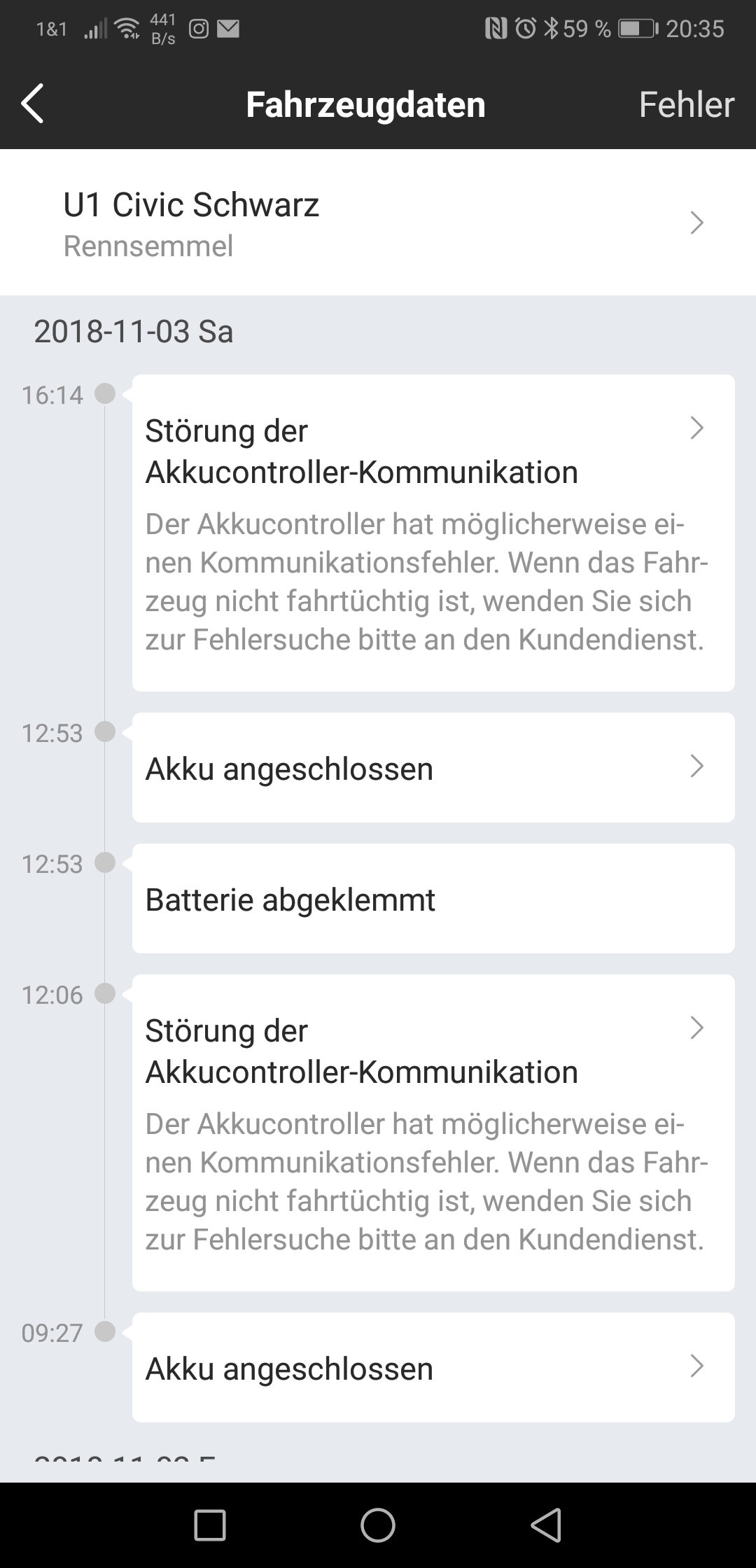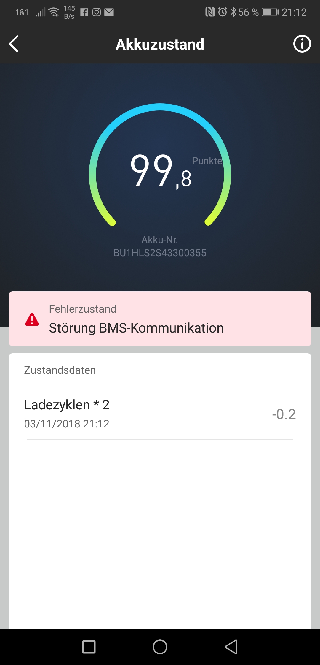 Ich würde da erstmal nicht so viel drauf geben, was die App anzeigt. Der Fehler bei der BMS-Kommunikation kann auch eine Software-Geschichte sein, die mit einem künftigen App-Update zu beheben ist. Die Tatsache, dass das BMS die Zyklen hochzählt ist schonmal positiv, etwas mehr könnte man übers Diagnosegerät in Erfahrung bringen. Ich bitte zu Bedenken zu geben, dass sich BMS und App erst kalibrieren müssen. Das BMS braucht mindestens 3 volle Ladezyklen um einen sinnvollen Akku-Ladestand (SoC) in % anzugeben, die App benötigt 7 Tage kontinuierliche Fahrzeugnutzung für eine Reichweitenprognose.