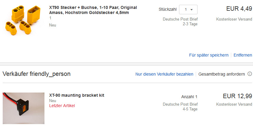 Habe mich für XT90 Stecker aus dem Modellbaubedarf entschieden, sie sind Verpolungssicher und gut zu verarbeiten wie ich finde. Der kleine Bruder XT60 hätte doppelt gereicht von den Ampere, da der XT90 aber auch schön gross ist, gefällt er mir von der Haptik besser. Vollends überzeugt war ich dann, als ich im innern des Akkus einen original verbauten XT 90 Stecker fand. Hier hätte man jetzt schön mit Y Stecker arbeiten können. Diese gibt es in der Bucht auch direkt mit angelöteten Kabeln. Die billigen benutzen 12 AWG, die besseren haben 10 AWG, also dickere Kabel. Hatte ich beides nicht und ausserdem sind Y Stecker (parallel) immer falschrum. Also hab ich die originalen Kabel in Ruhe gelassen und einfach parallel dazu ein Plus angelötet und eine Ringöse zum Minus dazugeklemmt. Dann hab ich ein wenig mit mir gehadert, das TK15 Coulometer lag ja auch noch rum und wie geil wäre es wenn es auch noch dazwischen wäre und beide Stecker über das Ding laufen würden, dann könnte man schön kucken. Prinzipiell wäre genug Platz im Gehäuse aber es wäre eine elends Fummelei an lauter Sachen unter Spannung gewesen und das Shunt ist ziemlich schwer. Die Befestigung hätte damit nach aussen durch gemusst und dann sind da Teile ggf unter Spannung draussen dran und ich habs dann einfach gelassen. Wenn der Akku leer ist, wird man es schon merken.