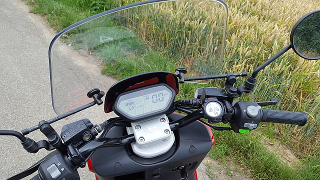 Die große Scheibe hat ein interessantes Fahrgefühl. Man sitzt tatsächlich komplett abgeschirmt dahinter und hört nur den Motor und die Abrollgeräusche. Wenn man das Gestänge erstmal montiert und ausgerichtet hat ist das An- und Abbauen am Lenker ne Sache von 5 Minuten.