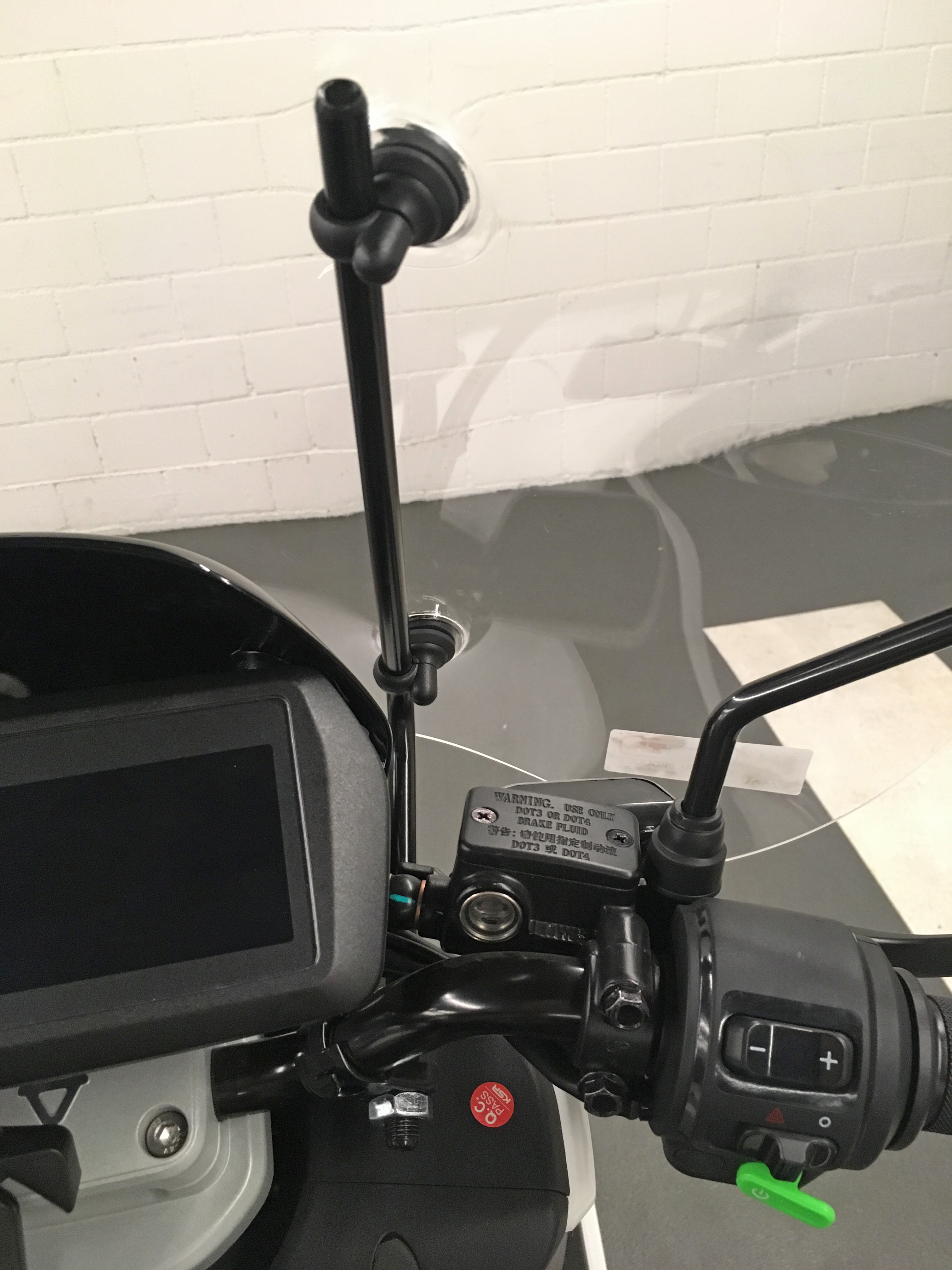 Der NIU-Windschild, der über die Spiegel befestigt wird, macht bei manchen Kunden Probleme. Da sind auch schon die Befestigungen durchgebrochen. Zudem ist die Bohrung der Befestigungslöcher etwas suboptimal.