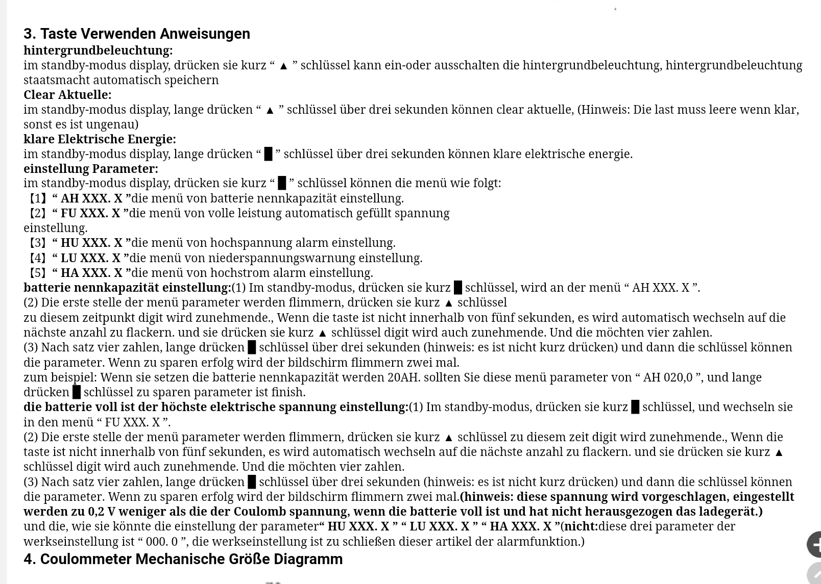 Der andere Knopf kurz halten stellt die Strommessung auf Null. Der Wert wandert um bis zu 0,3 A weg über Stunden scheint mir. Manchmal zeigt er auch minus an, er kann wahrscheinlich die Richtung anzeigen. Es ist auch ein Pfeil auf dem Abnehmer.