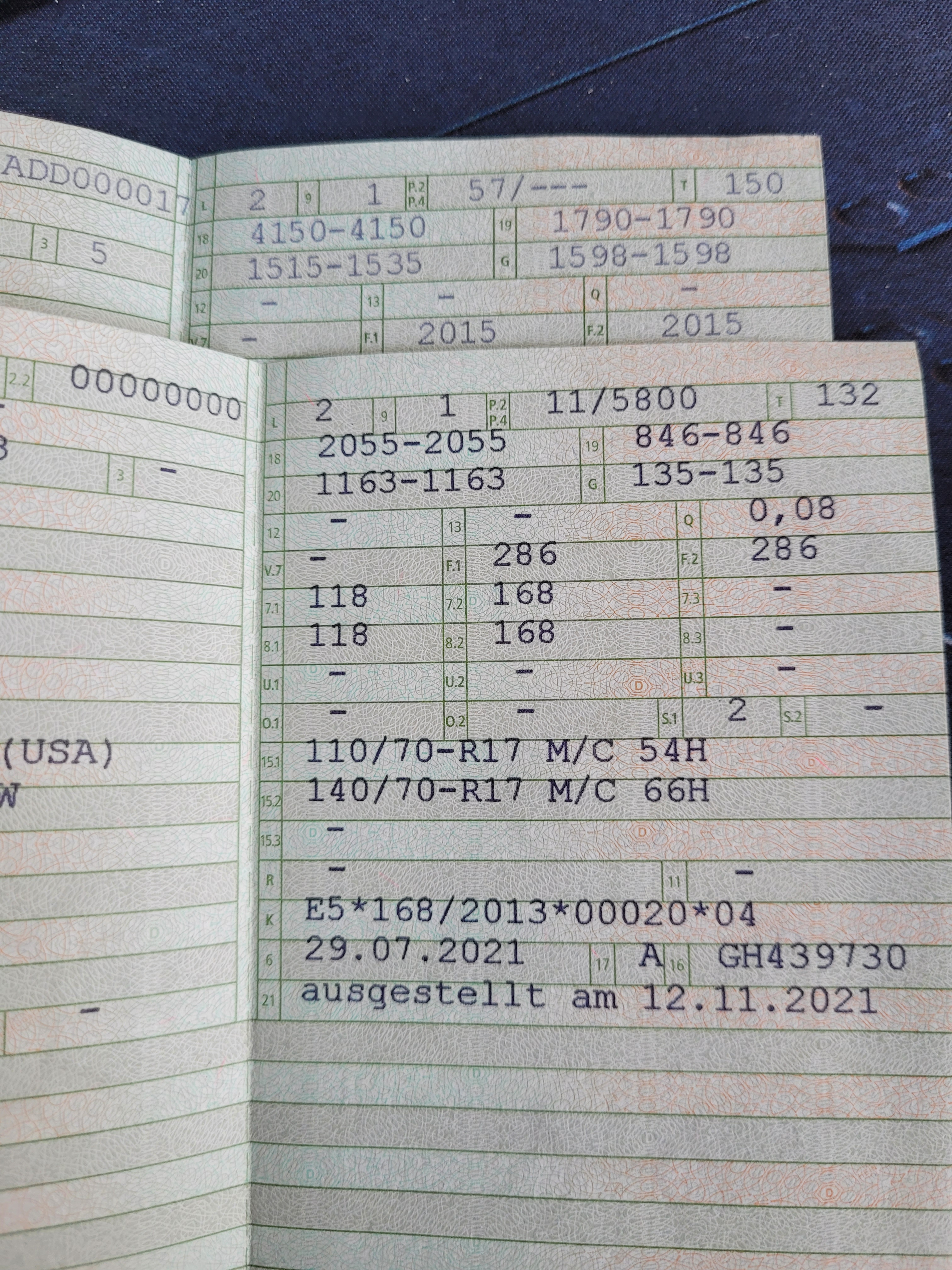 L3e-A1, okay. Das is ja schon mal richtig. ABER: Leergewicht nur 97kg (Anstatt 133kg) und damit ein Leistungsgewicht (Feld Q) von 0,11. So steht es auch in den COC Papieren. Das ist für einen A1 oder B196 Führerschein ja leider 0,01 zuviel!