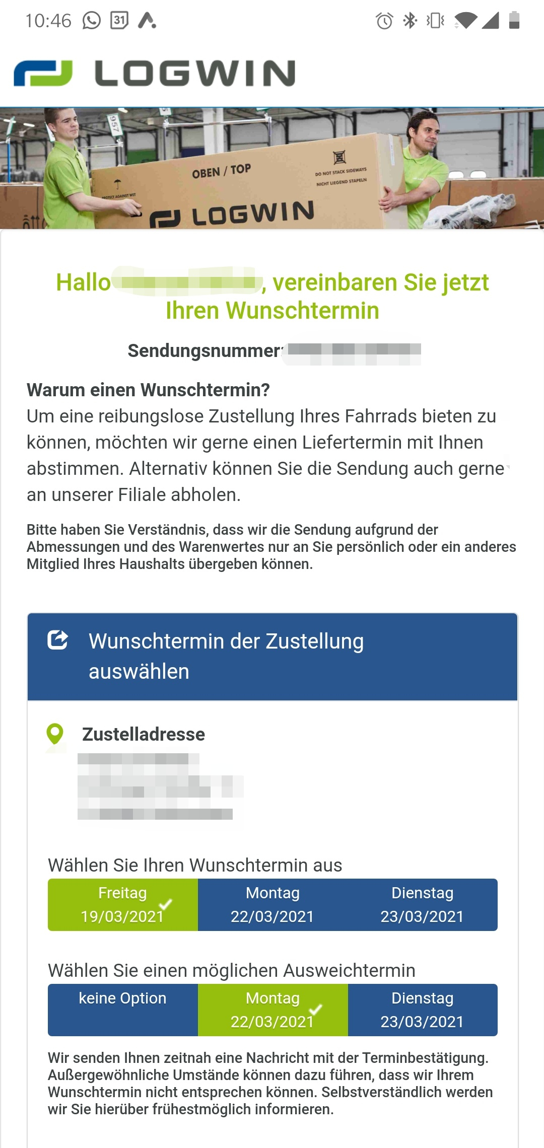 Gestern habe ich nun mal auf Google geschaut und das Logistik-Zentrum in Karlsfeld hatte eine weitere Telefonnummer, die ich dann angerufen habe und siehe da - es geht jemand ran! Ich wurde dann an die Dispo weitergeleitet und man konnte mir dann sagen, dass die Lieferung dann halt auf heute Vormittag gelegt wird.
