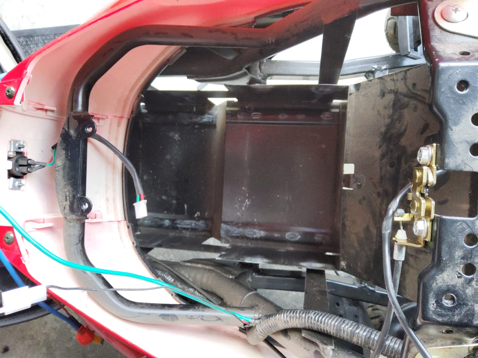 Ich fing also an zu basteln. Zuerst kamen die Blei Akkus raus und ich habe den Lithium-Akku an ihre Stelle gesetzt. Es passte, obwohl der Händler mir gesagt hatte, dass das nicht geht. Bei der Probefahrt, jetzt 46 Kilo leichter, hat es mich beinahe nach hinten runtergehauen, so ging der auf einmal los. Damit erstmal zufrieden, montierte ich noch ein 48l Topcase auf den riesigen Gepäckträger und schraubte den "Hundekorb" vorne ab.