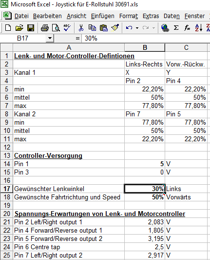 Gern geschehen, war spannend :D Die fett markierten Felder in der Excel sind am ehesten für Änderungen vorgesehen, alles andere sind entweder Werte aus der Joystick-Spezifikation oder meine wüst zusammengestrickte Mathematik. Sie wäre gewaltig zu vereinfachen, wenn z.B. die Eingabewerte von links 0 nach ganz rechts 100% gehen würden.