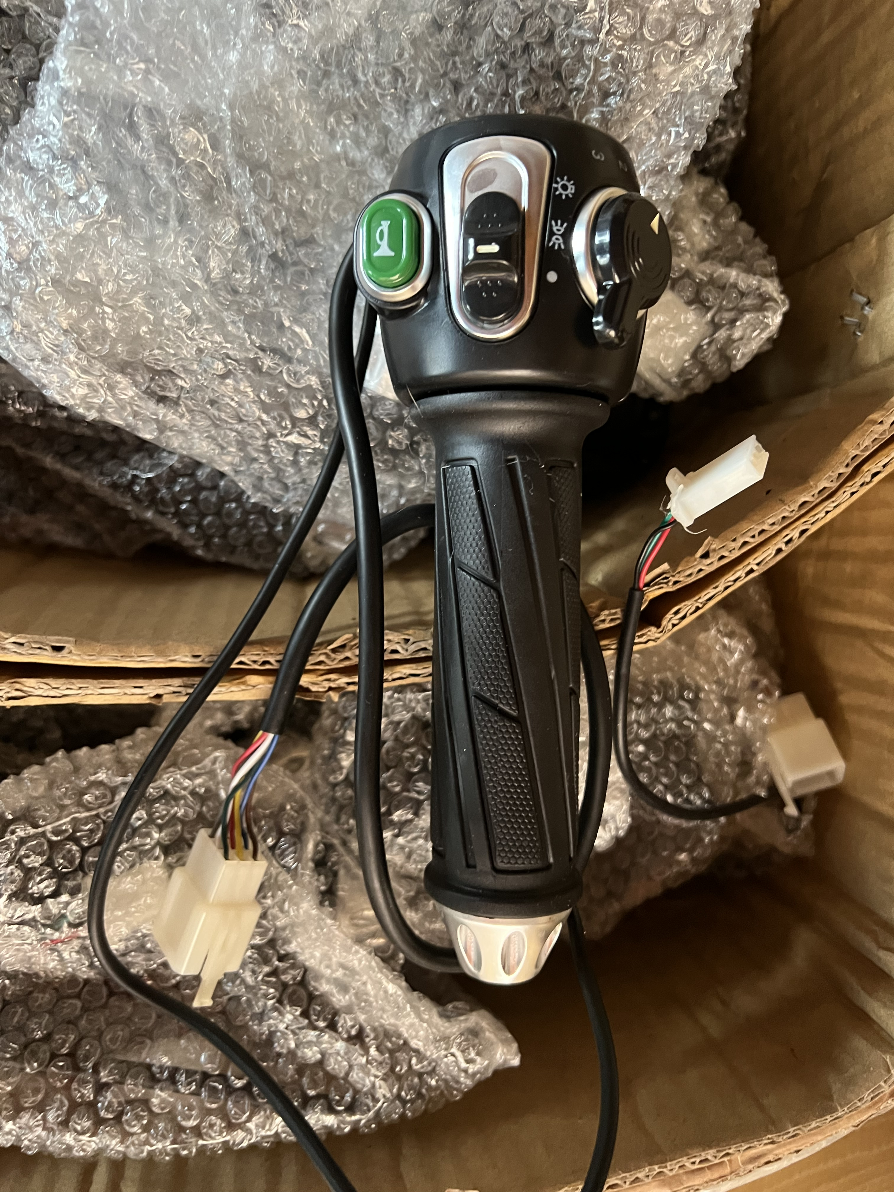 Auch Fahrzeuge von nova-motors.de verwenden solche Griffe mit Schalter. Da ist man mit über 100 Euro für das Paar Griffe dabei. Aber ohne Foto vom Stecker, mag ich die nicht empfehlen, weil die evtl. keine ControllerUmschaltung bewirken.