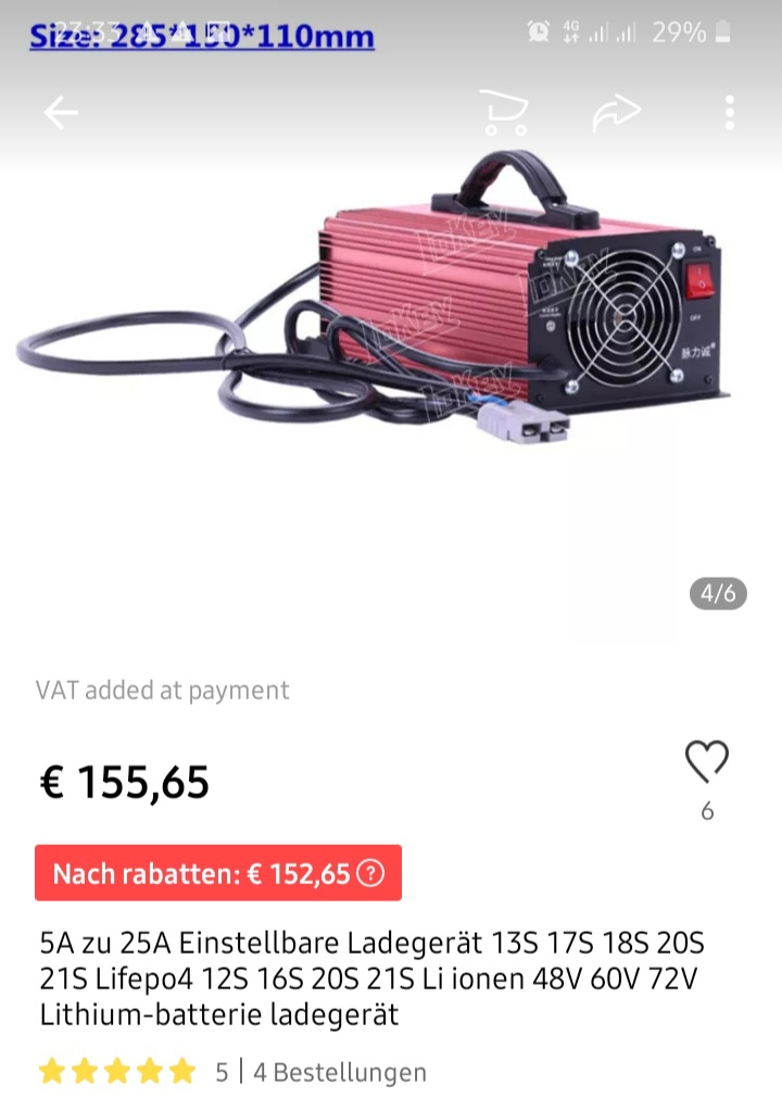 ja, das was Du beschreibst, el Bosso, scheint mir realistisch, auch wenn das 8A Netzteil bisschen mehr macht (Ist es dieses hier? https://de.aliexpress.com/item/10050013 ... 78decb29-0  hat bei mir aber alle 5 pins..weiß aber nicht ob "verdrahtet") Aber in nur 60 min wäre das ja fast nochmal "doppelt" so schnell, vor allem auch im Vergleich dazu, dass ich damit 2 Akkus in ca 8h lade (ok, im Roller) scheint mir das doch sehr schnell.