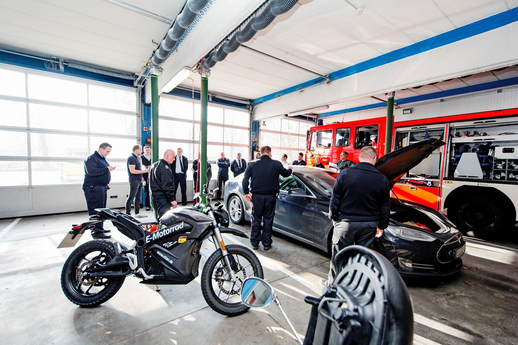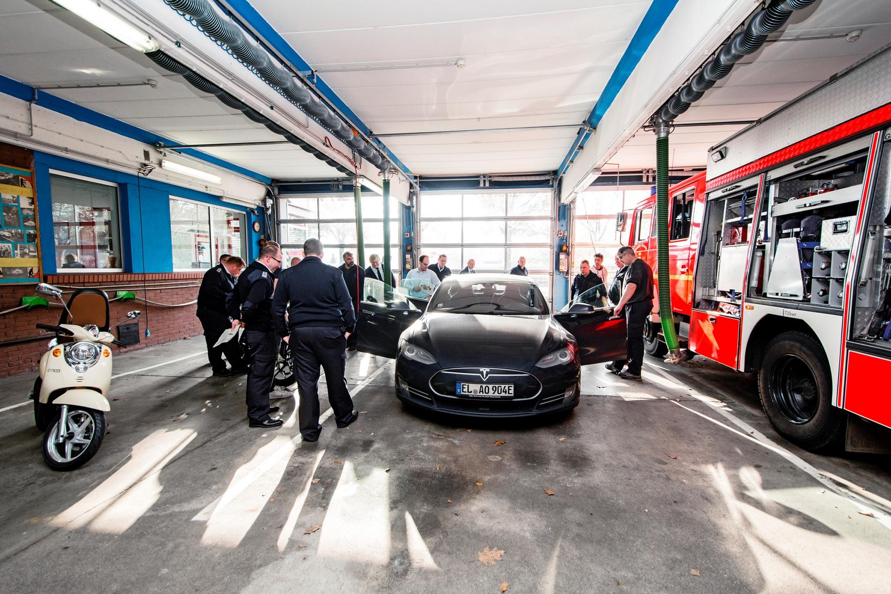 Genau deshalb hat die Freiwillige Feuerwehr Meppen am Samstag von uns eine umfangreiche Schulung zu dem Thema erhalten. Wir haben uns dabei weniger mit PowerPoint, als mit den tatsächlichen Fahrzeugen beschäftigt. Als Anschauungsobjekte hatten wir einen Emco Novantic, eine Zero DSR sowie ein Model S dabei. Dabei haben wir auf diverse Materialien (Rettungskarten und Handbücher) der Hersteller zurückgegriffen und Nottrennstellen etc. an den Fahrzeugen identifiziert und deren Wirkung besprochen. Elektrotechnische Grundkenntnisse und allgemeine Fragen zur Elektromobilität haben die Schulung abgerundet. Die meisten waren schon gut informiert, es gab präzise und kompetente Nachfragen. Eine abschließende Mitfahrt im Model S hat dann allen noch ein Grinsen auf das Gesicht gezaubert bevor es zur nächsten Station ging