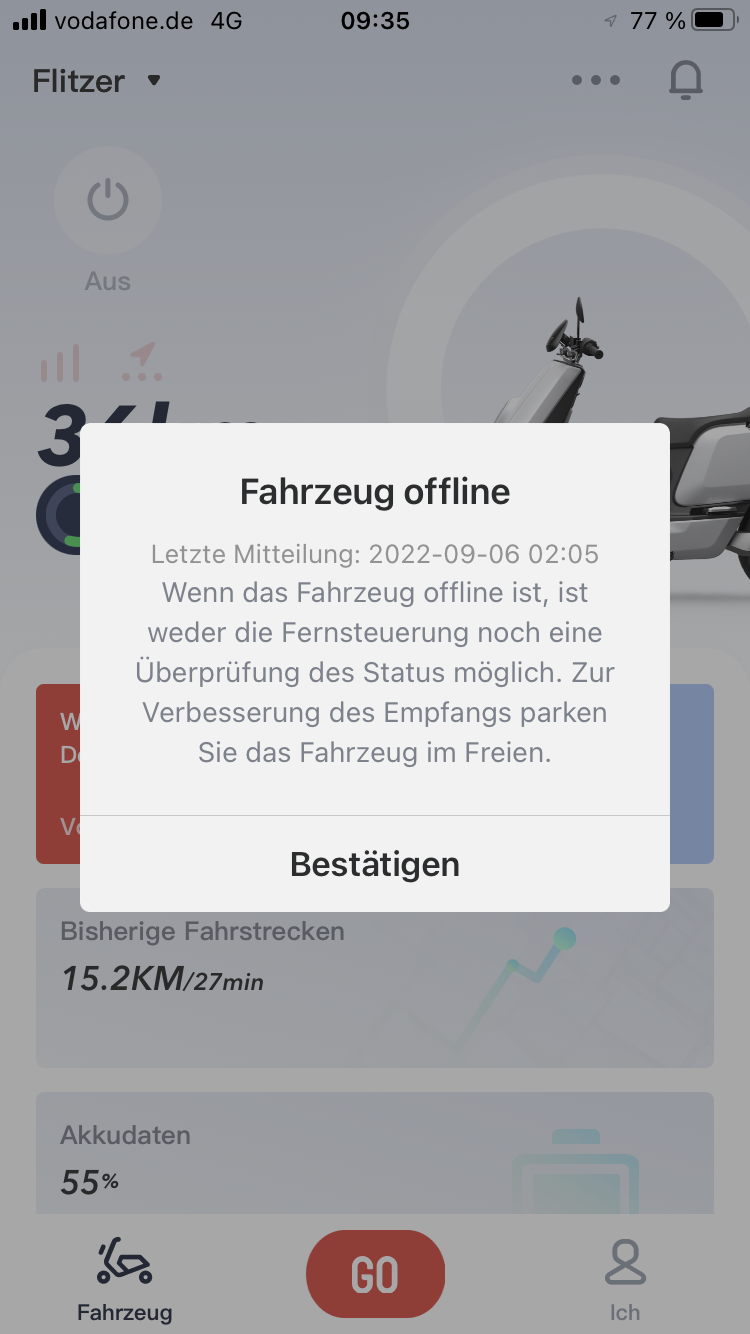 Da bin ich jetzt mal gespannt ob mein seit 10 Tagen offleiniger N1S Bj 2018 nachher wieder online geht.bedauerlicherweise handelt es sich bei deinem Problem um einen Bug in unserem System, welcher vor kurzem entdeckt wurde, ich bitte um Verständnis. Wir haben bereits unsere App-Abteilung eine Lösung finden lassen.Heute im laufe des Tages sollte es dir wieder möglich sein, die Daten deines NIU einsehen zu können. Sollte das Problem morgen noch bestehen meld dich bitte wieder bei uns.