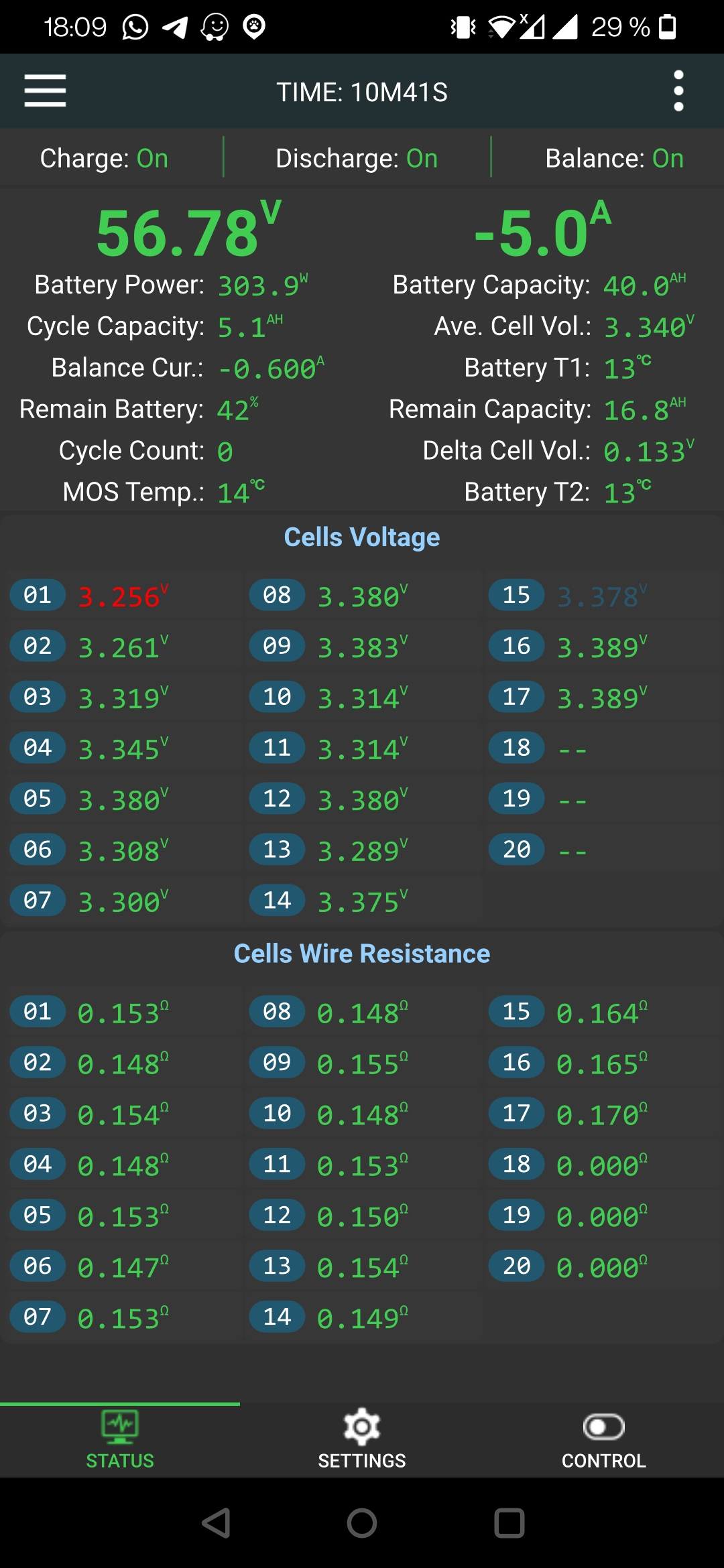Ich vermute, dass die Cell Wire Resistance auch den Innenwiderstand der Zellen messen. Sieht bei dir aber gur aus. Bei Werten > 0,75mOhm fängt das JK BMS an zu meckern - balanciert nicht mehr.