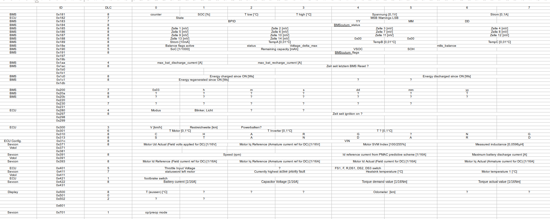 Die Bezeichnungen "Sevcon" in deiner Tabelle, Gerold, sollten aber wohl in "Motorsteuergerät" oder so geändert werden; ich habe einen Votol und da treten zumindest die IDs 371, 391, 411 auch auf, die du mit "Sevcon" bezeichnet hast.