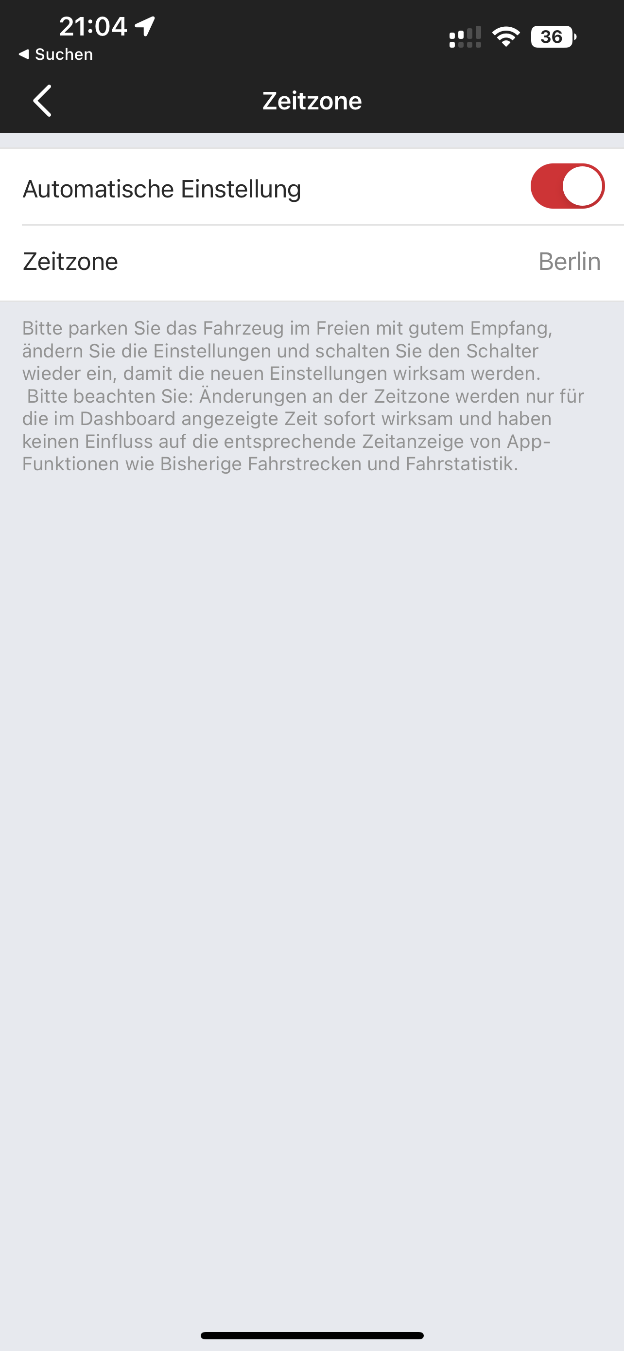 Bei Android auf "Ich", den Roller auswählen, dann unter Fahrzeugeinstellungen Zeitzone auswählen.