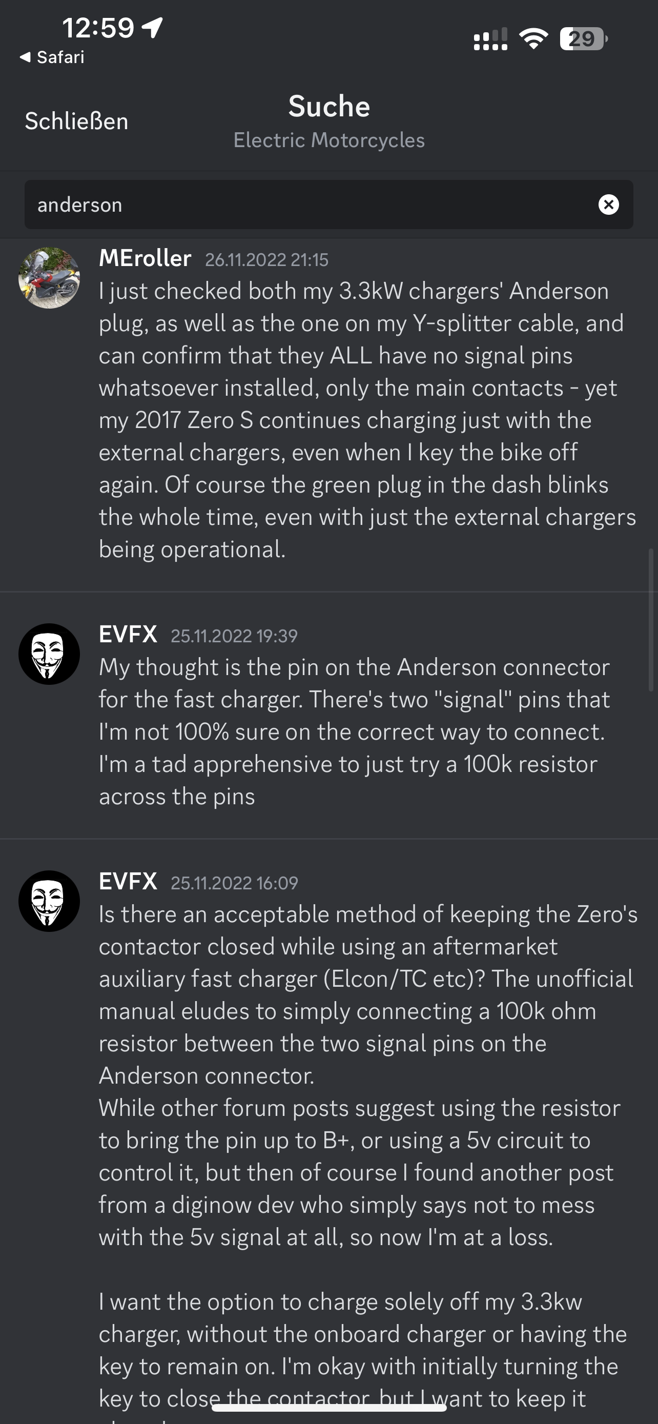 Schlüsselschalter auf AN, Schütz schließt, externer Lader beginnt zu laden. Dann kann der Schlüsselschalter wieder ausgemacht werden, Schütz bleibt zu während dem Ladevorgang. Aber der Anderson Stecker muss korrekt mit Widerstand bestückt sein, dass das funktioniert. Habe ich lang und breit im Electric Motrcycles Discord Kanal zum Besten gegeben, vielleicht auch hier im Forum.