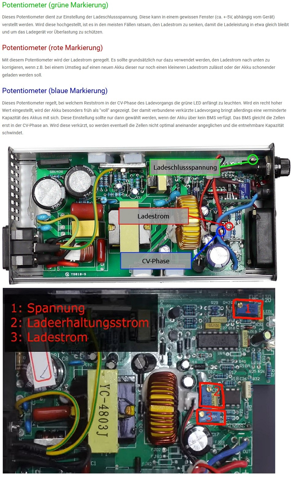 Der eine Poti ist für den Ladestrom in Ampere verantwortlich und der andere die Umschaltung zwischen CC und CV. Das ist i.d.R. bei Ladeschlussspannung - 0,3v zumindest bei Li-ion Akkus !!!