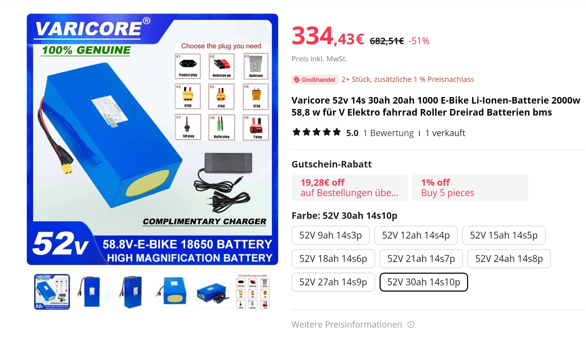 Hat ein Li-Ion-Akku dagegen 14 Zellen in Serie (14s statt 12s) lädt der bis maximal 58 Volt (also ähnlich wie Blei) und gibt im Mittel eine Spannung von 51 Volt ab (die Chinesen behaupten natürlich 52 Volt, na ja) und wäre leer bei Unterschreitung 42 Volt, wo ja auch der Blei-Controller abschaltet.