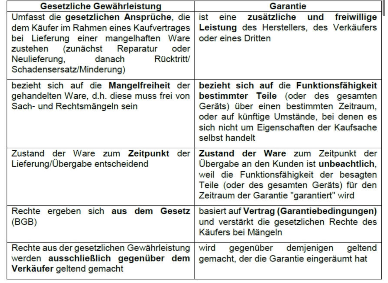 Einige Hersteller bieten auch eine Herstellergarantie an. Eine solche, von einem Dritten angebotene, Garantie ist jedoch eine freiwillige Verpflichtung, die stets nur neben die Gewährleistung tritt. Zur Veranschaulichung die folgende Gegenüberstellung: