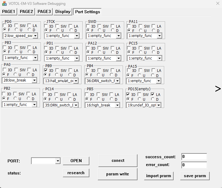 Im Moment von "connect" erscheinen in den Feldern der pages 1-3 und der port settings immer die im Gerät hinterlegten Programmierungen (egal was man vorher eingestellt hat). Die kann man überschreiben mit den Werten, die man braucht und mit "param write" an das Gerät übertragen.