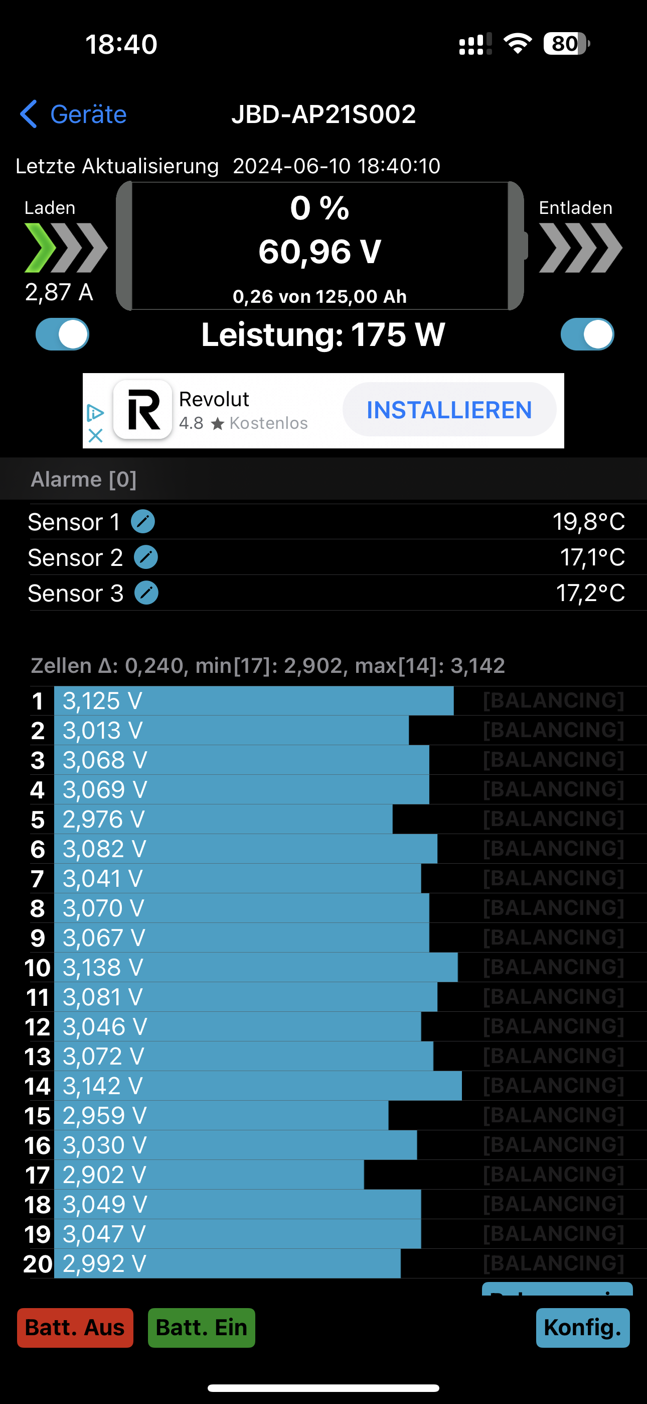Bin aktuell auf der Arbeit, Amazon liefert das Labornetzteil zwischen 16-19 Uhr. Ich bin zuversichtlich, dass das BMS öffnet sobald die Ladespannung höher als die Akkuspannung ist.