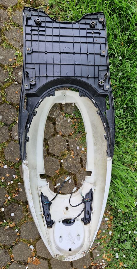 Wenn man alle Schrauben der Blende unter der Sitzbank löst lässt sich diese einfach demontieren: Der vordere und hintere Boden-Spritzschutz lässt sich einfach nach lösen aller Schrauben entfernen. Wenn man die Unteren Verkleidungsteile gelöst hat und alle Schrauben entfernt kann man den Fussboden und komplette hintere Verkleidung zusammen abnehmen. Das erleichtert die weitere Demontage.