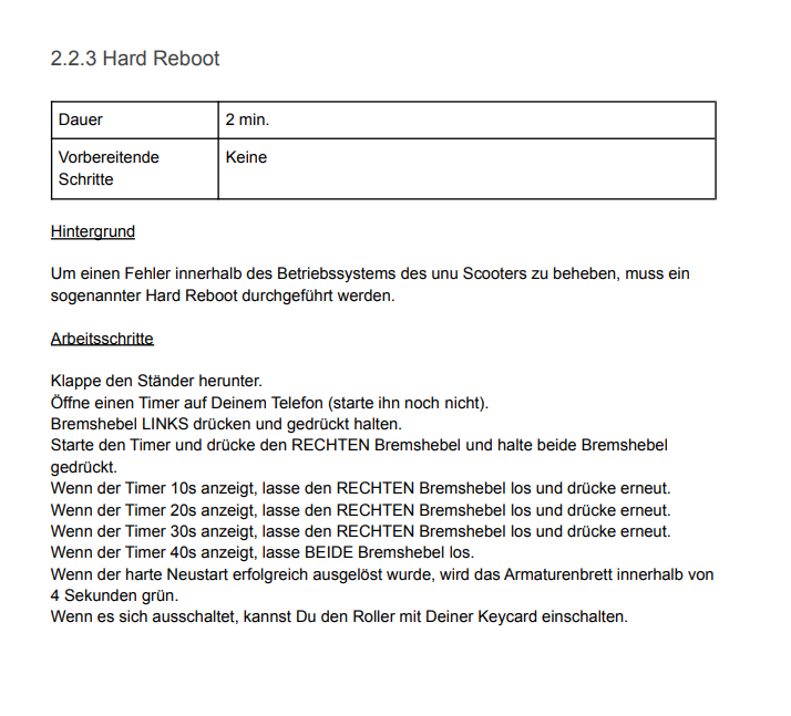 Du könntest versuchen, den Roller komplett neu zu starten Eine weitere Möglichkeit den Roller zu starten ist alle Akkus abzuziehen.