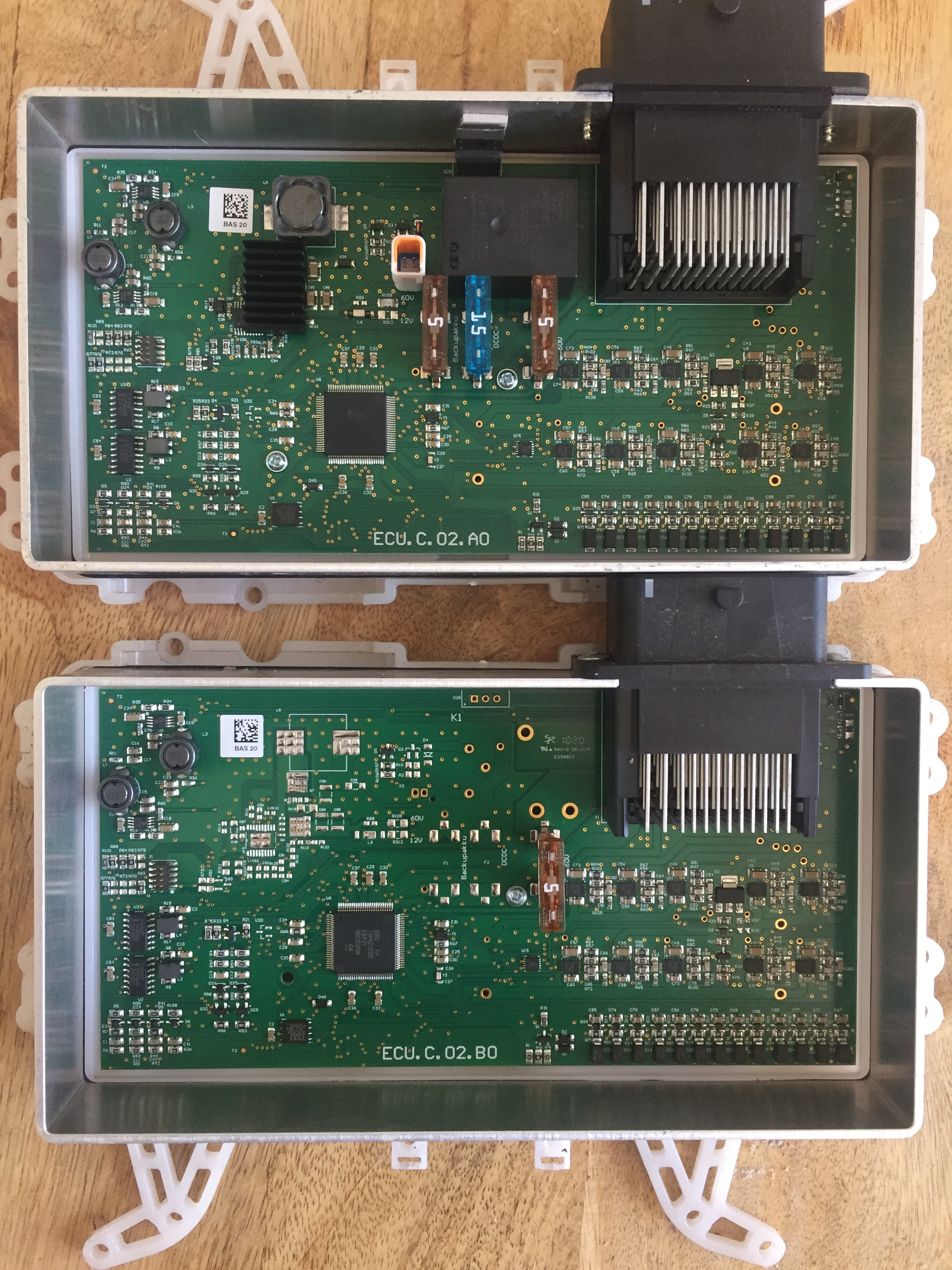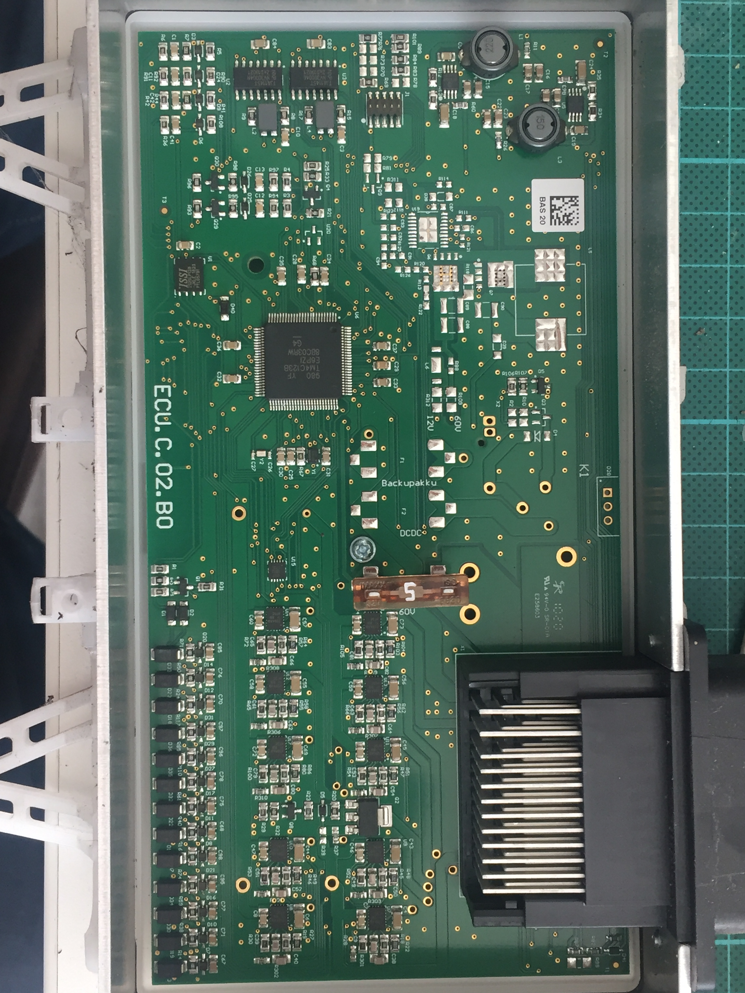 Dementsprechend uninteressant sind die beiden fast baugleichen ECUs. Die werden wohl hauptsächlich als eine Art Multiplexer funktionieren. Mehr ist ausser dem Controller, den Akkus und dem DC-Converter nicht drin in den Kumpans. Der Rest besteht aus passiven Komponenten (Kabeln, Schaltern, Verteilern)