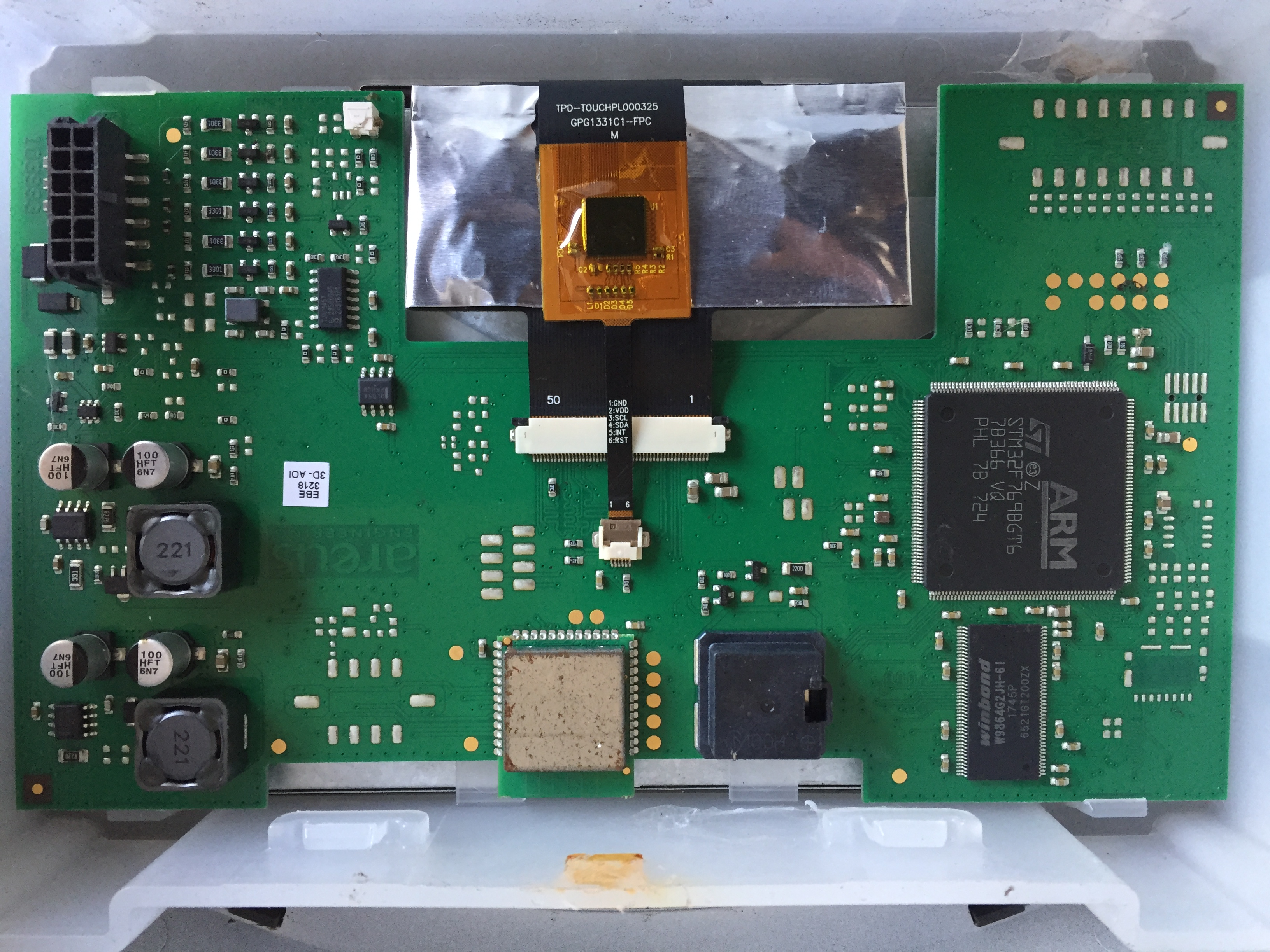 OK, Bilder, hatte nicht viel Zeit. Hier sitzt die Intelligenz, STM32, 64 MB extra Ram, ein zusätzlicher Microcontroller mit Antenne. So wie die DC-Converter aussehen läuft das Display wohl mit voller Akkuspannung. Werde mir das nachher mal genauer ansehen. Man beachte den Rost. Nach unten ist die Platine ungeschützt und sitzt in einer billigen Plastikkiste. Denen muss wirklich das Geld ausgegangen sein.