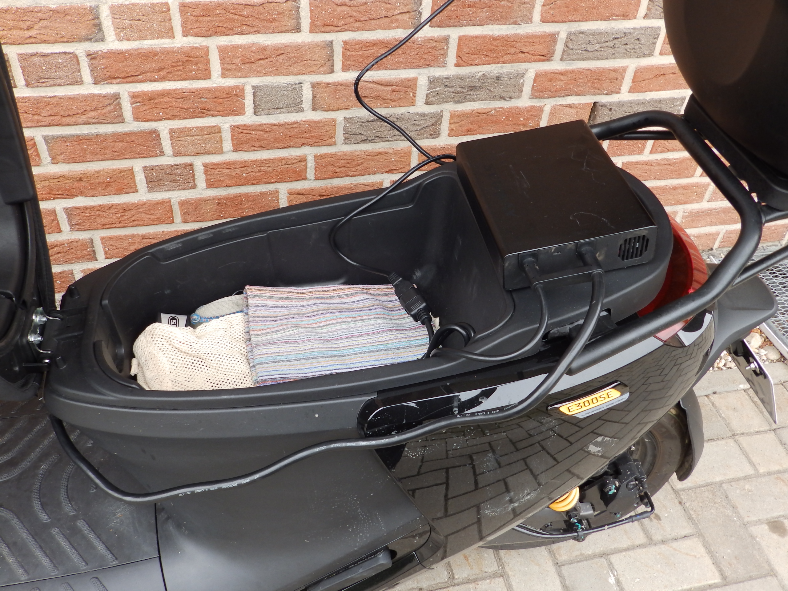 Das Ladegerät lege ich beim Laden hinten unter die geöffnete Sitzbank, siehe Fotos. Da bekommt es genug Luft und ist einigermaßen gegen Regen geschützt (siehe Fotos).