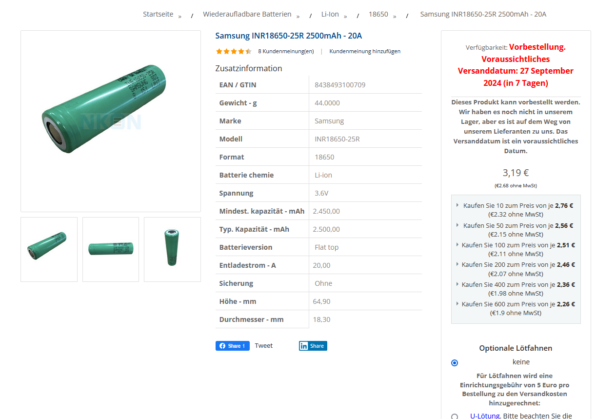 Ich würde von den Kauf von Zellen bei Ali oder Ebay eher abraten. Sicher gibt es da seriöse Händler und gute Wahre, aber auch viel Müll und falsche Versprechen.