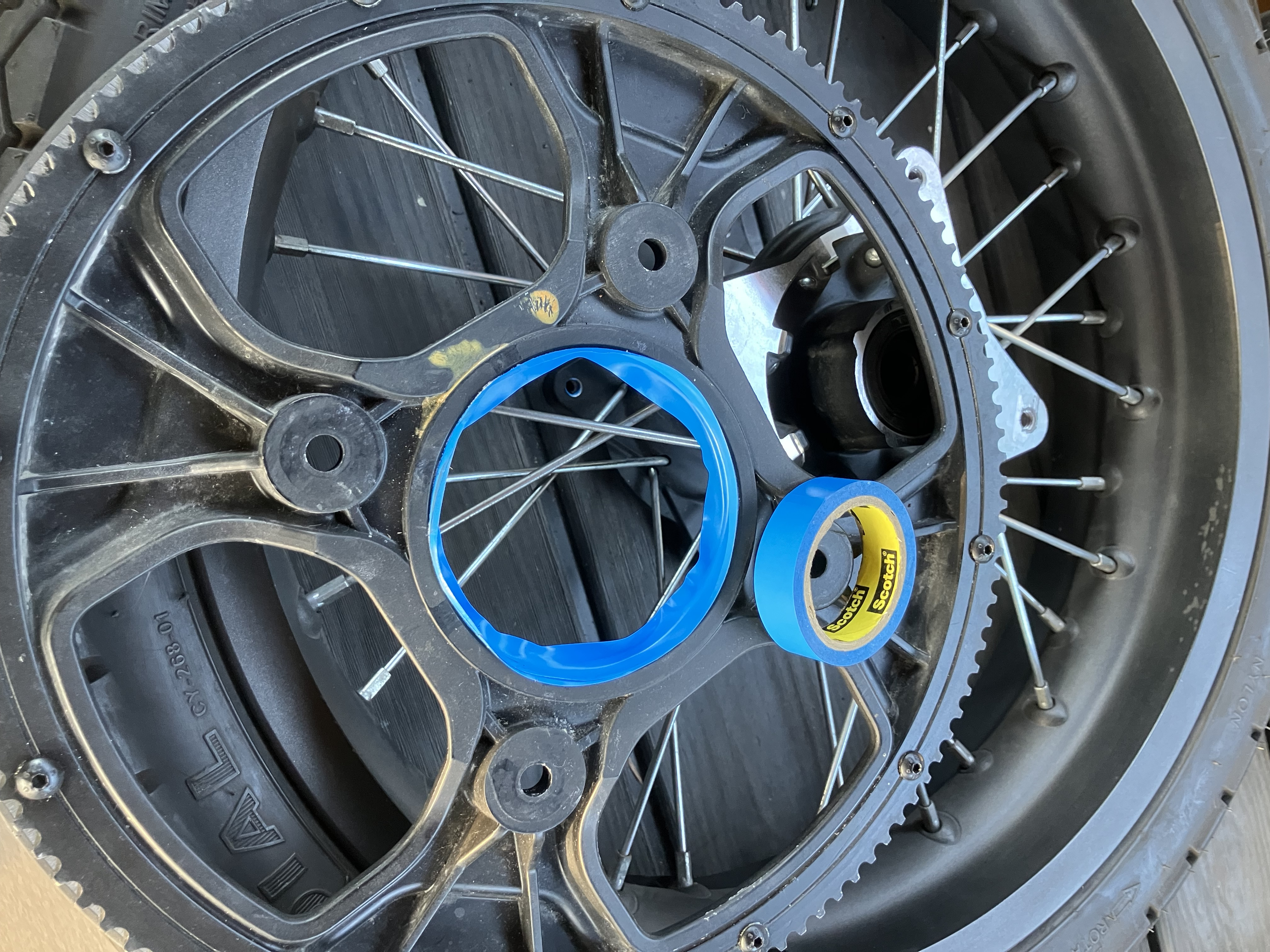Dann das Hinterrad wieder einbauen (Riemen noch neben der hinteren Riemenscheibe). Das ist etwas tricky - die Bremsscheibe muss wieder in den Schlitz (ggf. vorsichtig mit einem breiten Schraubendreher die Bremsbeläge ein klein wenig auseinander hebeln), die Spacer kann man zwar in die Wellendichtrinde etwas rein stecken - trotzdem wollen die runter fallen. Die Bremszange will gerne aus ihrer Halterung raus ruschen. Eine Hand wird für das einfädeln der Achse benötigt und das Hinterrad wird mit der Zeit auch ein bisschen schwer... Die Achsmutter aufsetzen, aber nicht fest ziehen.