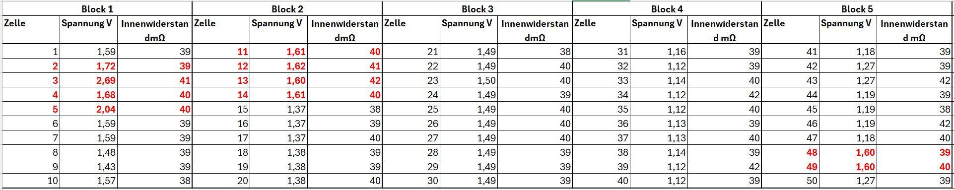 Oder ist der Energiegehalt bei der Spannung so gering, dass eine geringe Restentladung nach dem Trennen der Zellen bereits einen relativ großen Spannungsunterschied zur Folge haben? Ist doch schon merkwürdig, dass zwei einzelne Zellen aus einem parallelen Block z.B. 1,59 V zu 2,04 V haben (siehe Bild 1, Block 1, Zelle 1 & 5)