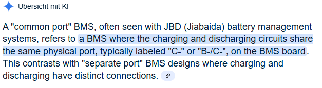 Außerdem ist das verbaute BMS (jbd-hp32s001) als "common-port" BMS ausgelegt. D.h. Laden und Entladen läuft über die gleichen Anschlüsse.